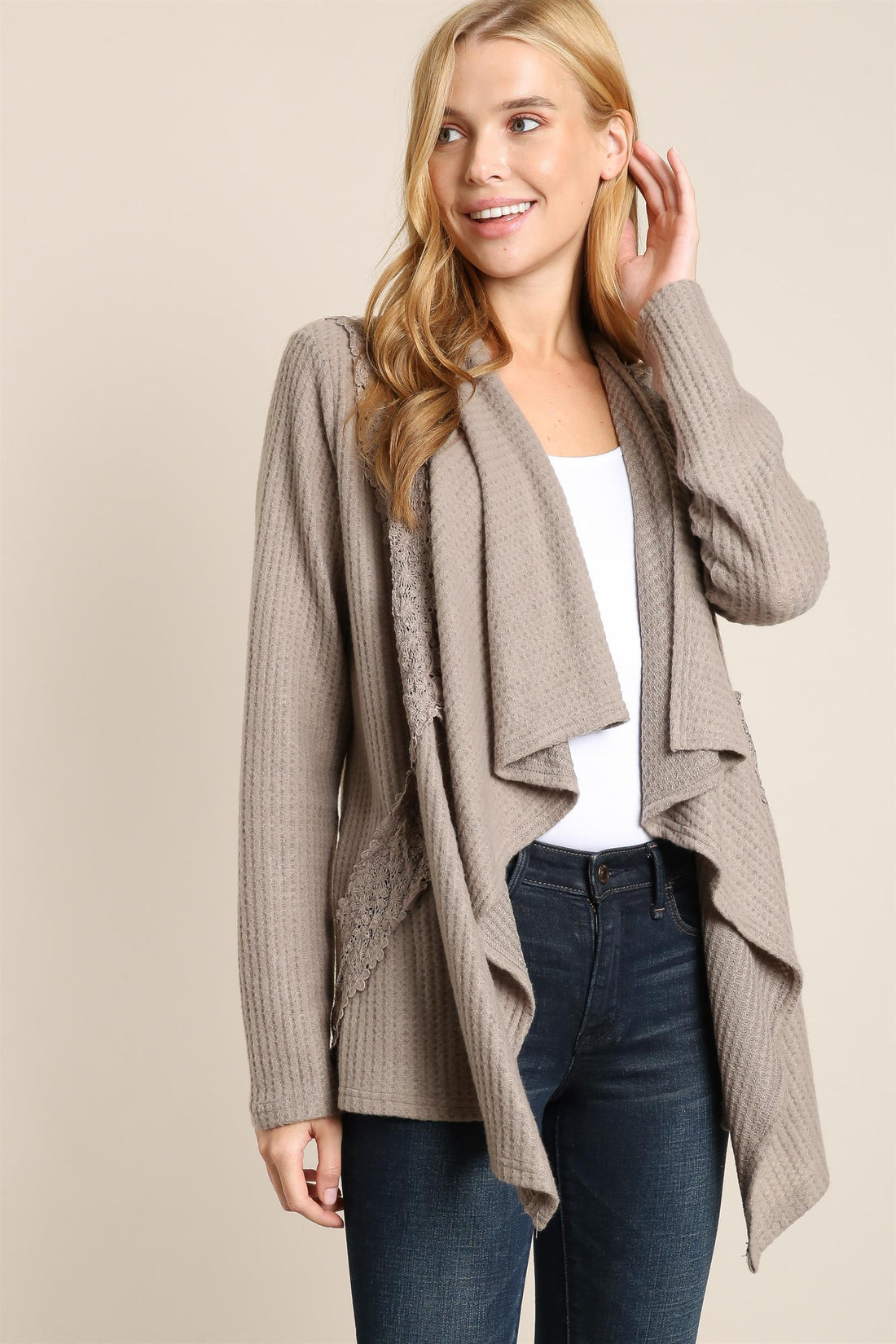 Draped Neck Lace Insert Knit Cardigan - Mocha