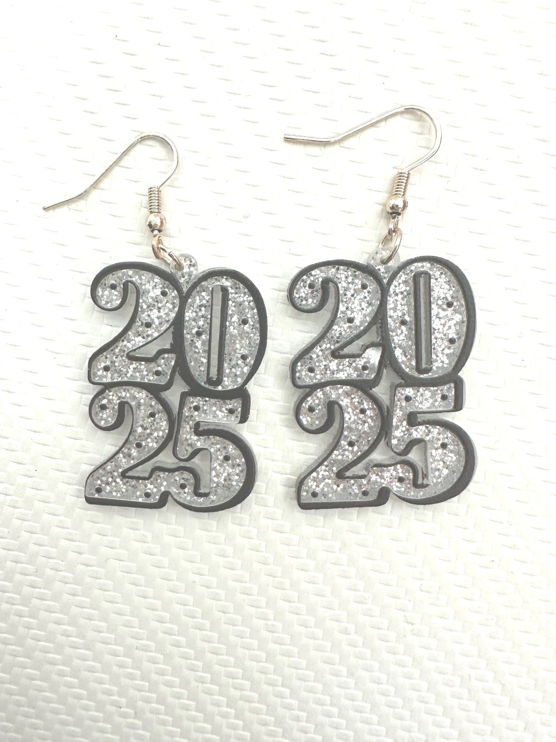 These light-weight soft polymer 2025 silver glitter dangle earrings will complement any look you have...