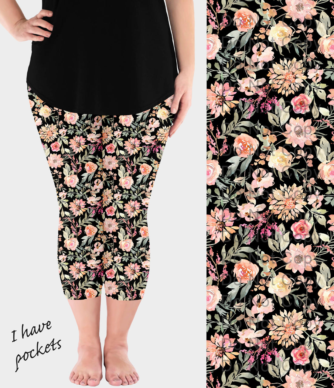 RTS - Peach Dahlias Capri Leggings w/ Pockets