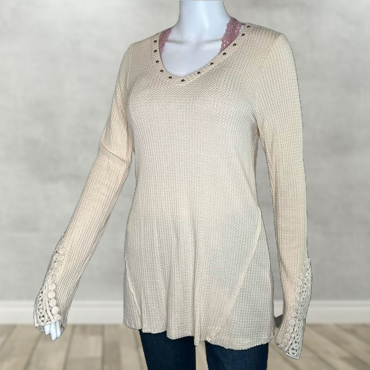 Step into spring with this whimsical waffle knit top featuring a notched collar neck and...