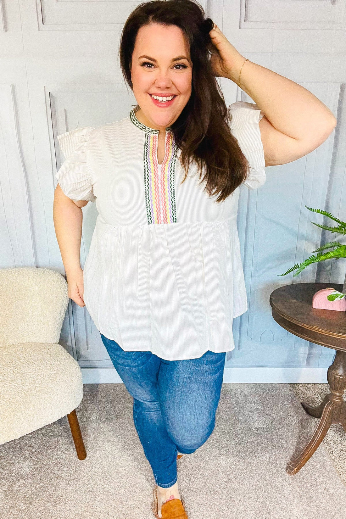 California casual vibes describe this yarn dyed striped woven babydoll top with short flutter sleeves,...