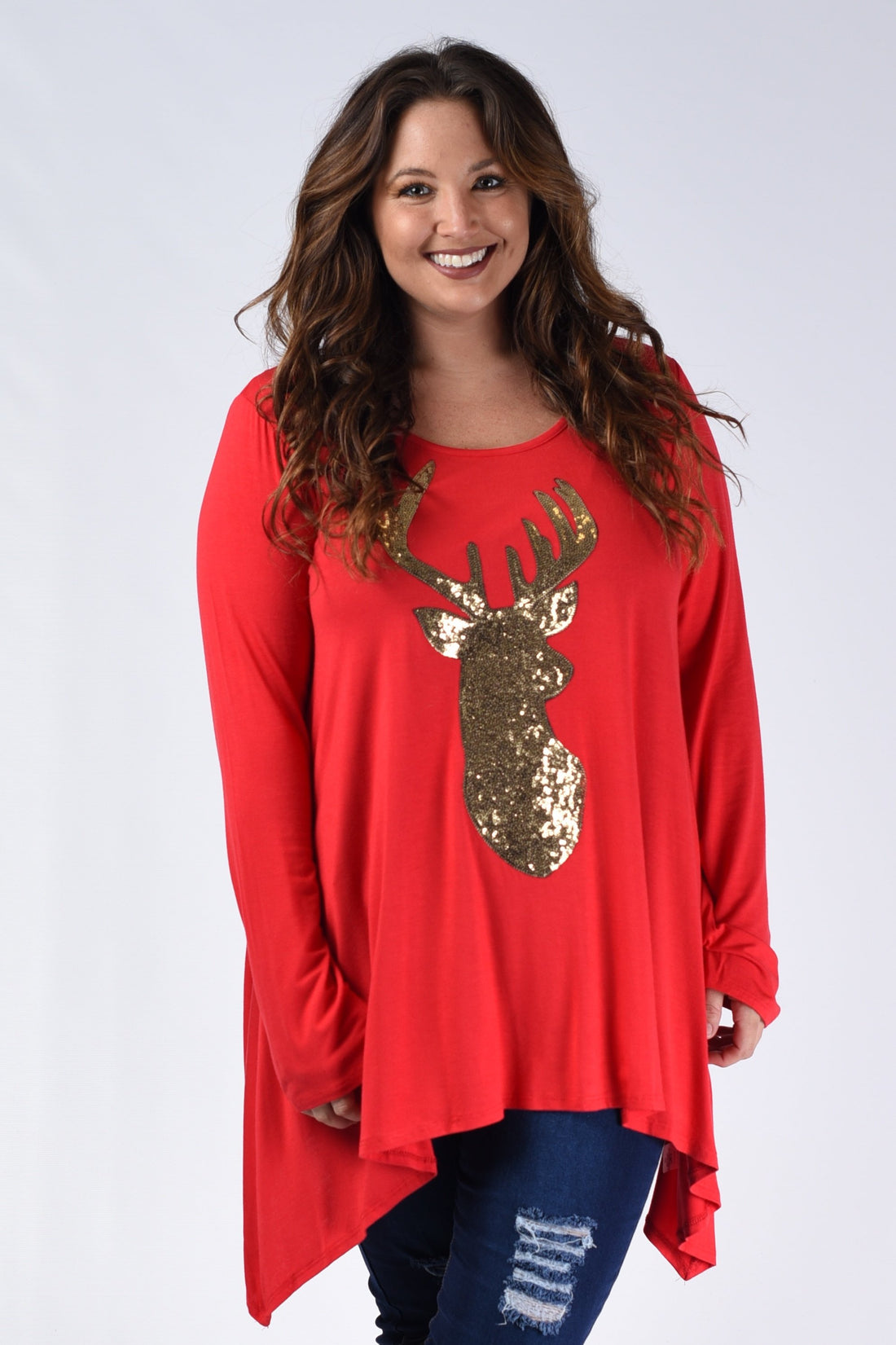 Festive Red Sequin Reindeer Long-Sleeve Top