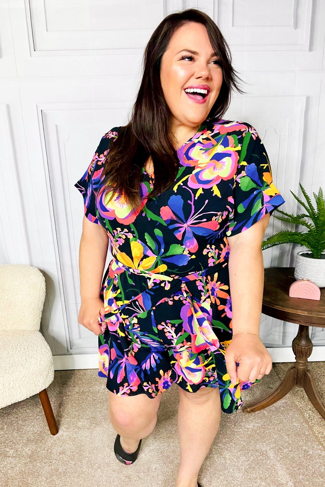 Highlight your fun side with this black floral print surplice flared shorts romper with an...