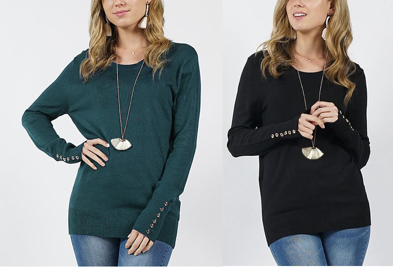 Turn heads with this unique two-tone jacquard waffle knit round neck top featuring banded sleeves...
