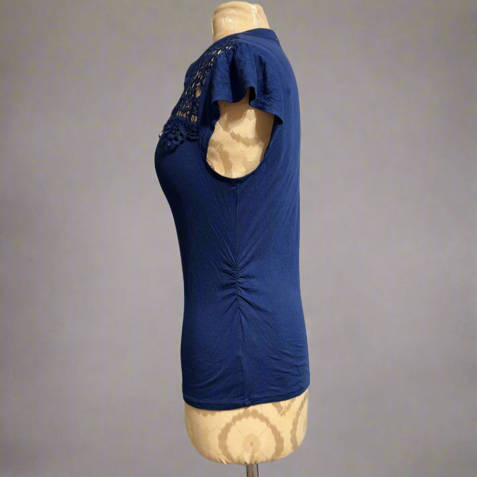 Navy Blue Lace Detail Cap Sleeve Button Top