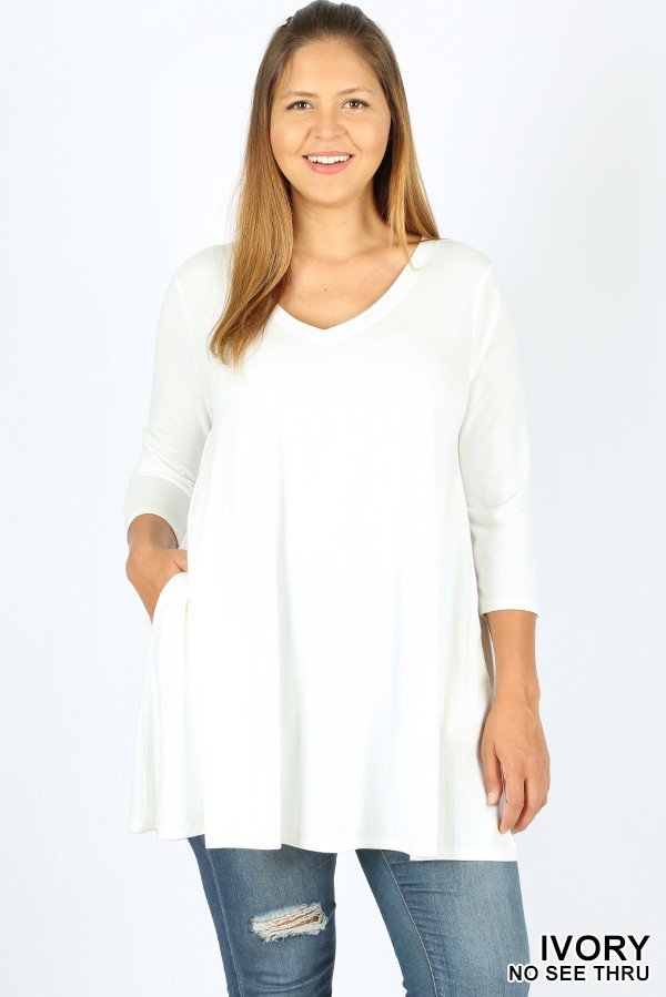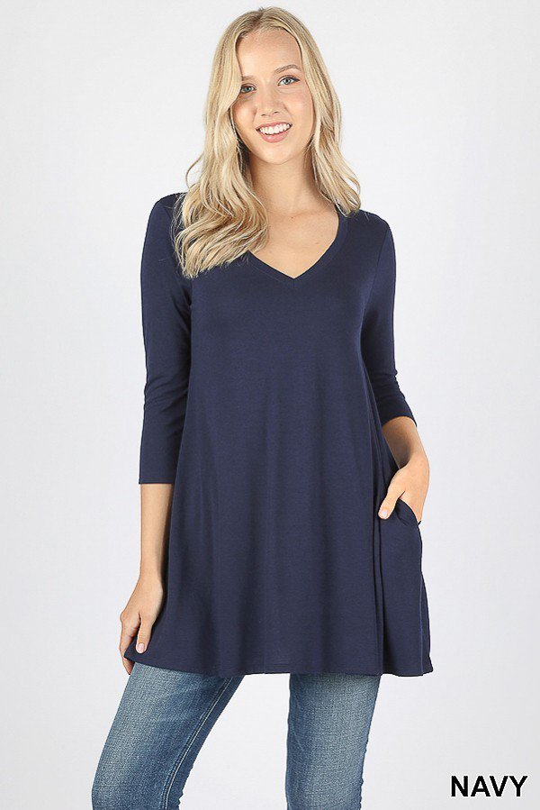3/4 Sleeve V-Neck Round Hem Top With Pockets