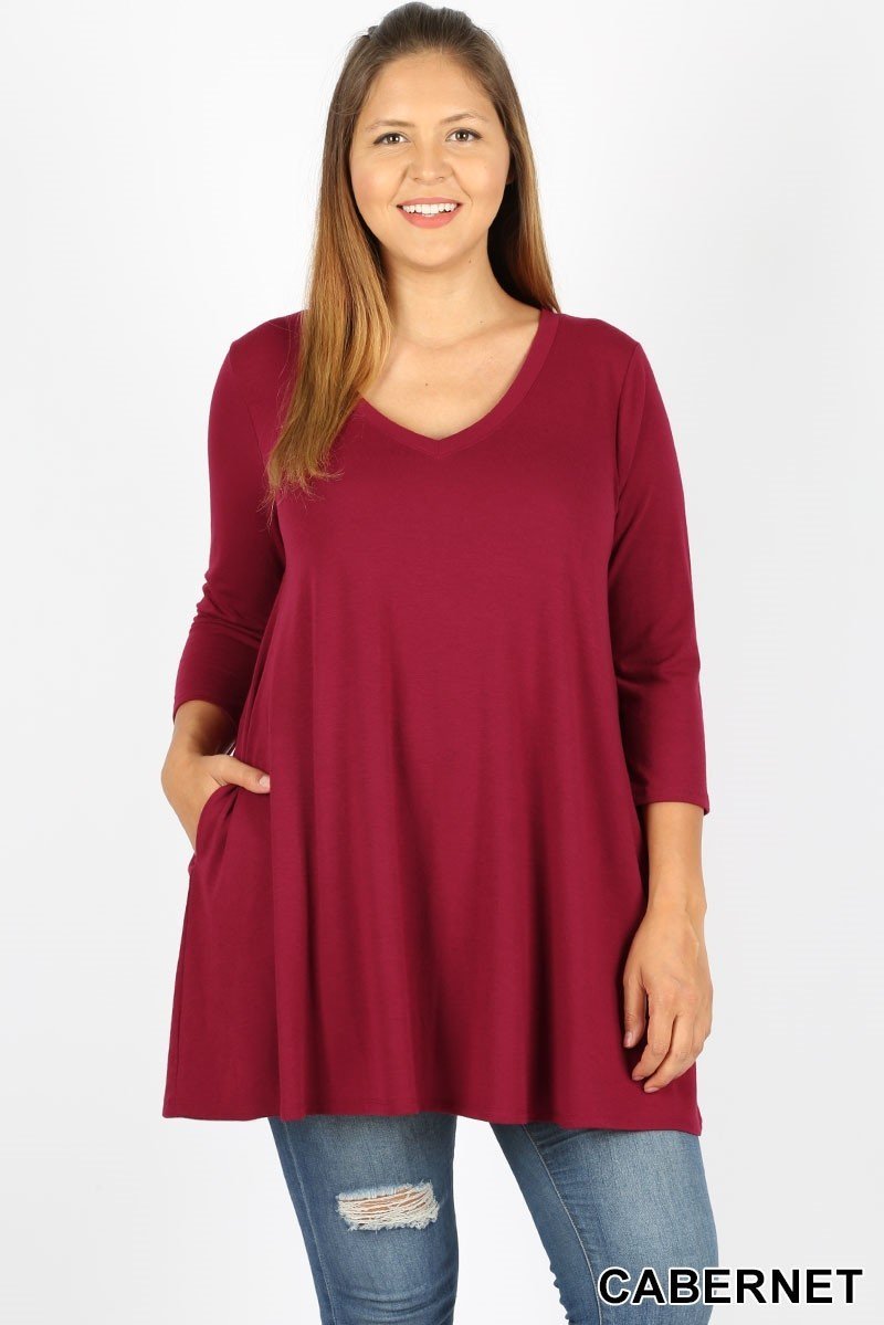 This 3/4 sleeve top features a straight hem and a flattering V-neck design. Its extended length offers versatility, allowing it to be worn almost as a dress. Crafted from a blend of 55% polyester, 40% rayon, and 5% spandex, the fabric provides excellent stretch and comfort. Functional side pockets add practicality without compromising style. Ideal for pairing with black leggings and boots, this piece is a sophisticated choice for transitioning into fall. Made in Vietnam.