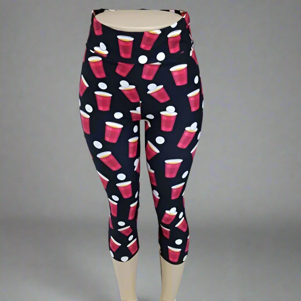 Beer Pong Red Cup Print Capri Leggings - Fun Party Game Inspired Legwear