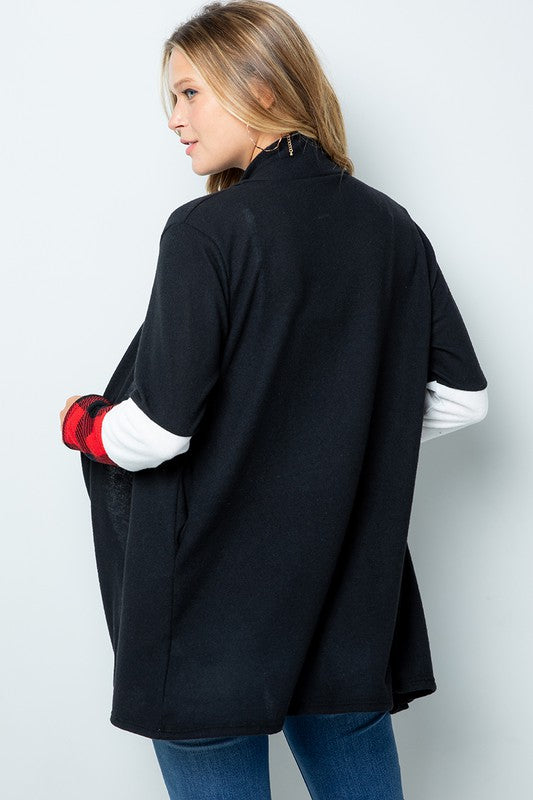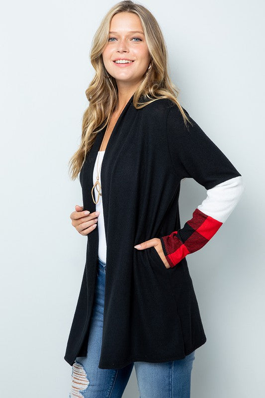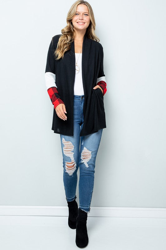 Red Buffalo Plaid Contrast White Sleeve Open Black Cardigan with Pockets