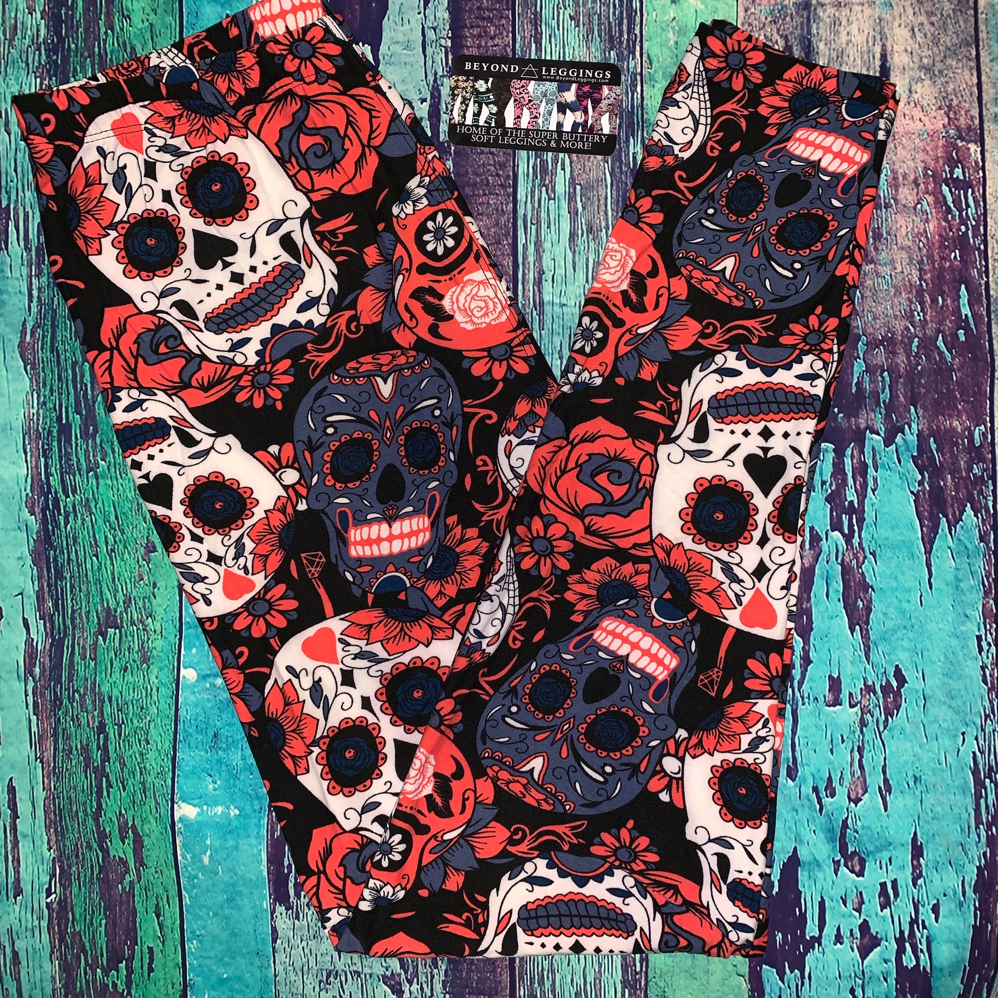 Coral Roses & Flowers Sugar Skull Print Soft Leggings