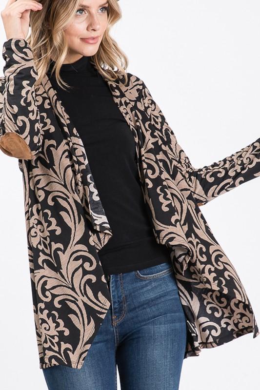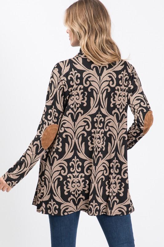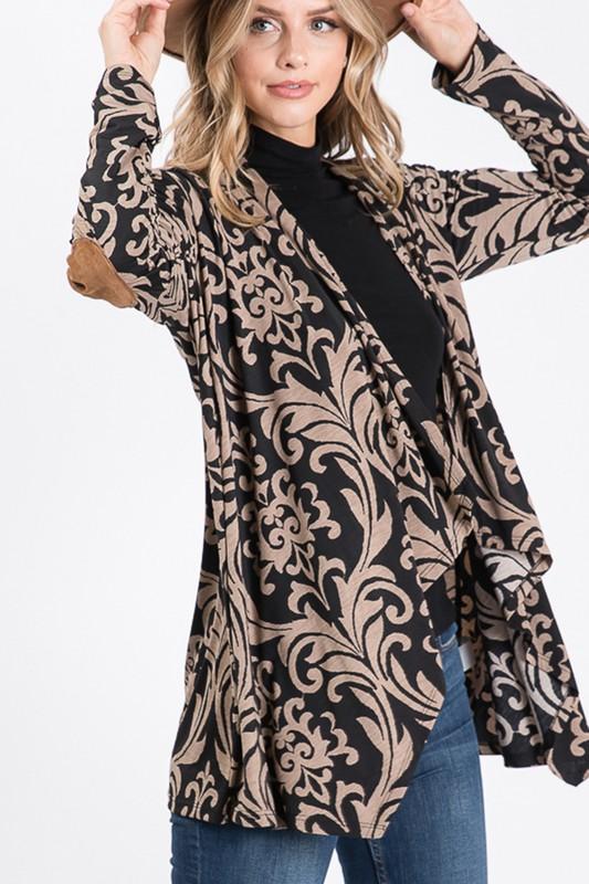 Our Damask Elbow Patch Cardigan features a tan and black paisley print with elbow patch, making it perfect for elevating any everyday look. The open front design adds a cozy layer and is sure to become your go-to cardigan.