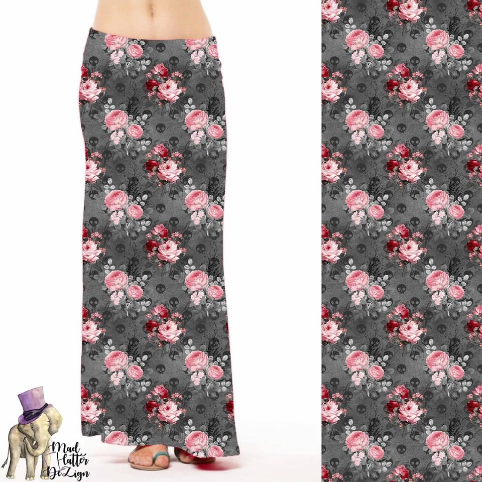 Deadly Bouquet - Skull and Pink Roses Floral Print Maxi Skirt / Strapless Dress