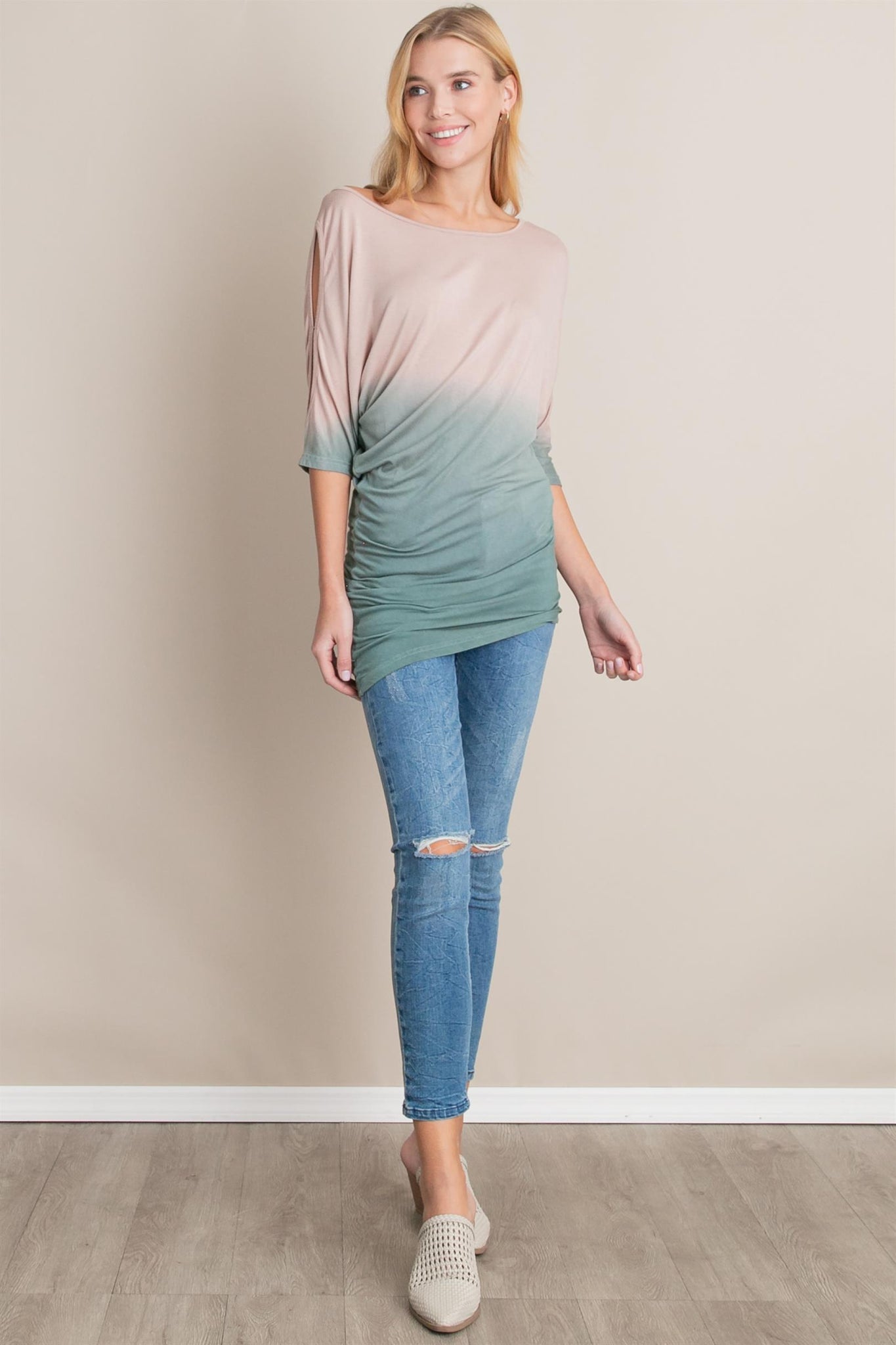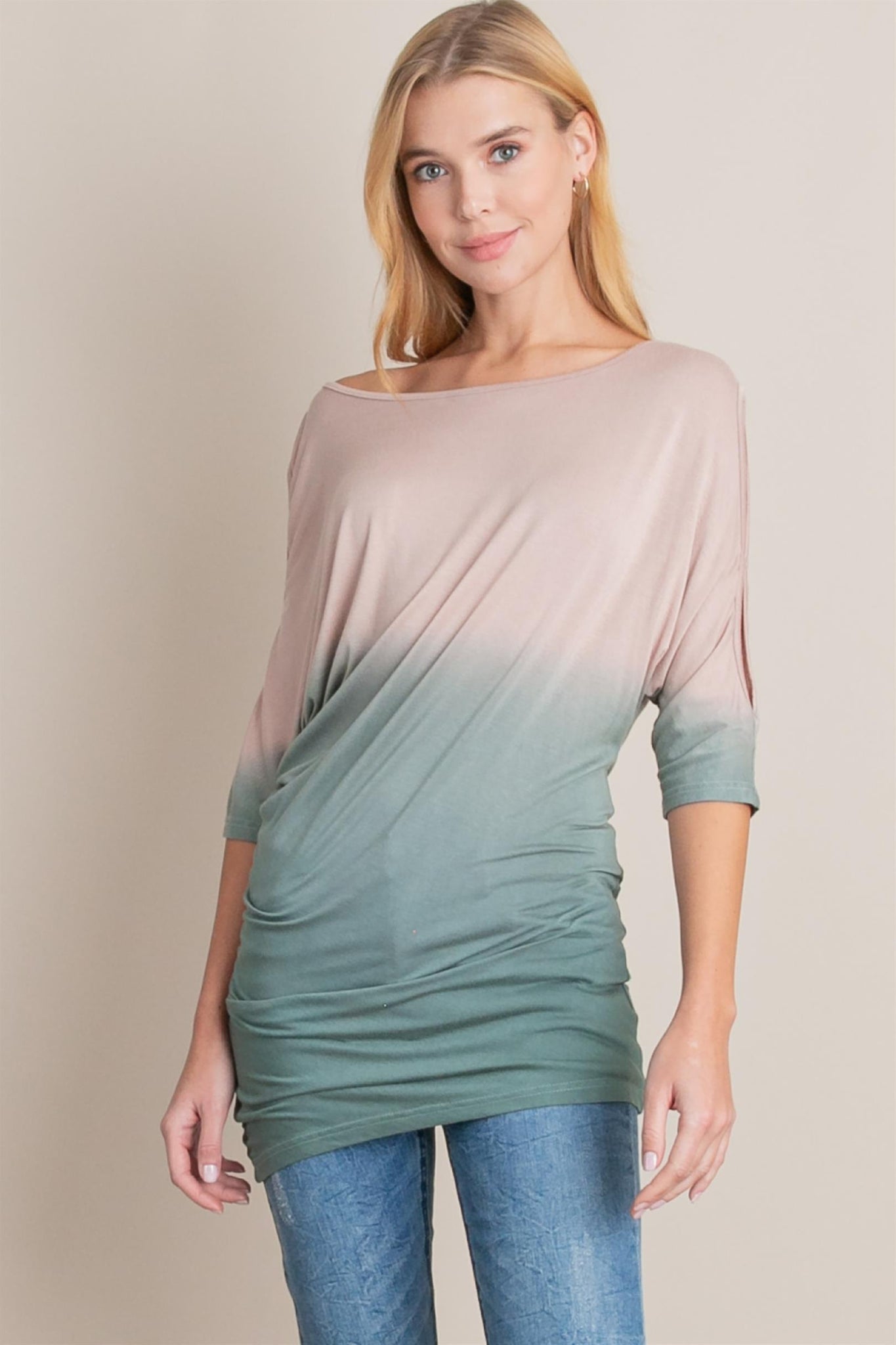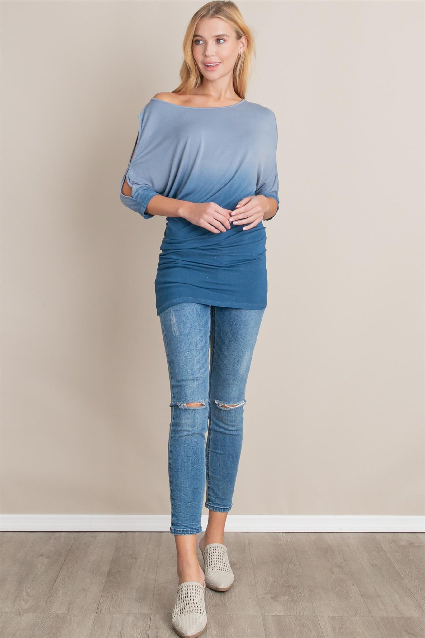 Make a chic statement with this dip-dye ombre top, blending colors for a stunning gradient effect. The asymmetric neckline and cold-shoulder cutouts add a modern, flirty touch, while the relaxed dolman sleeves and ruched hem create a flattering fit.