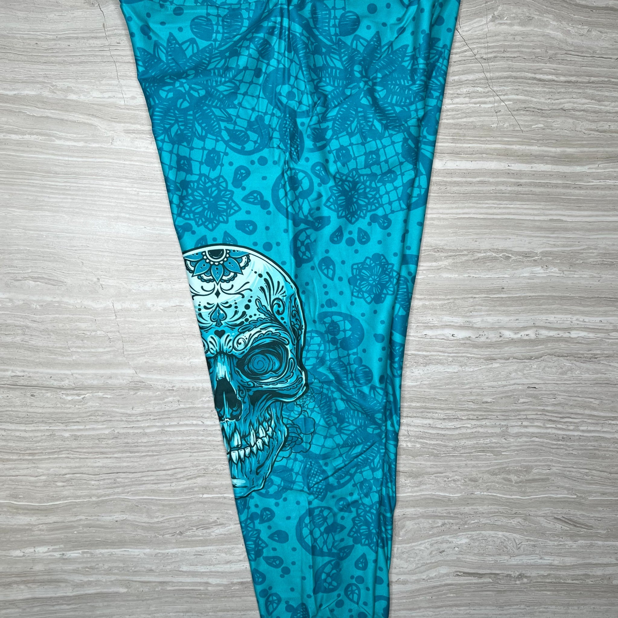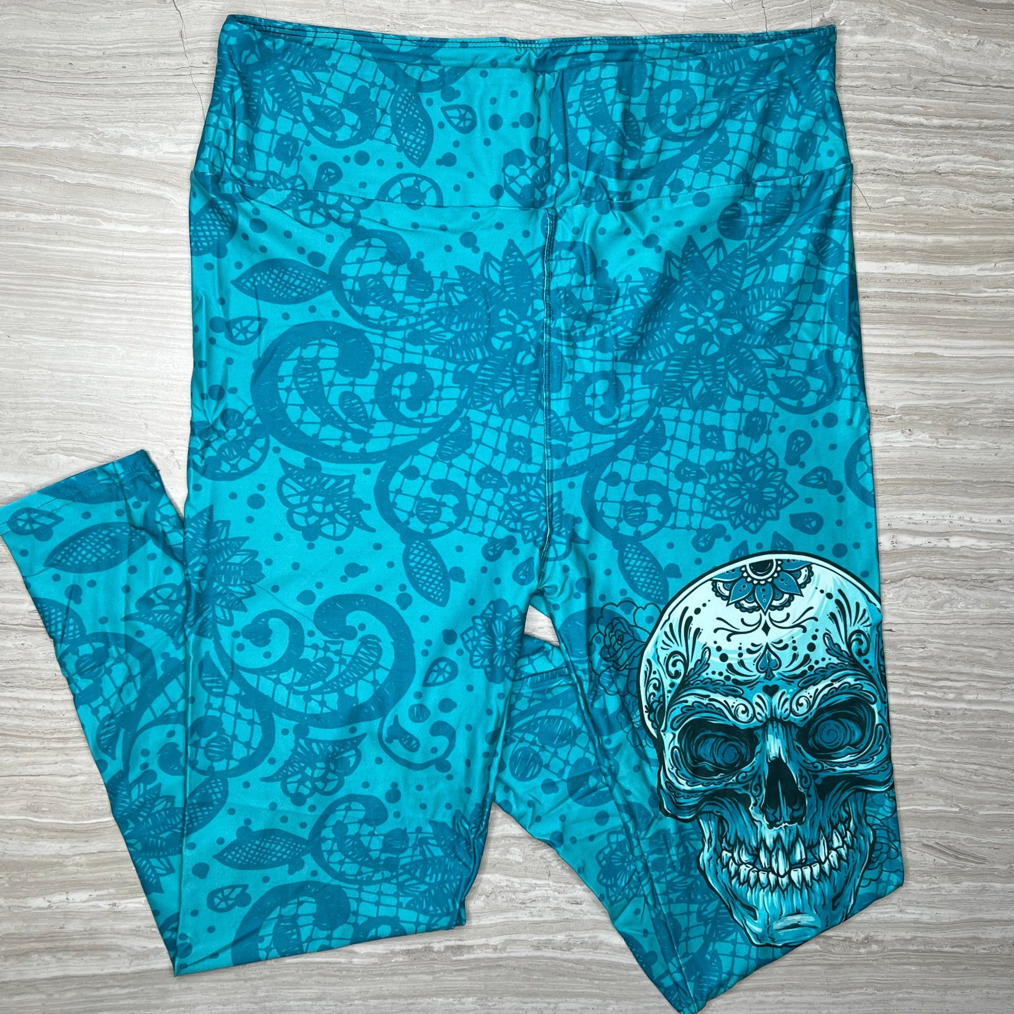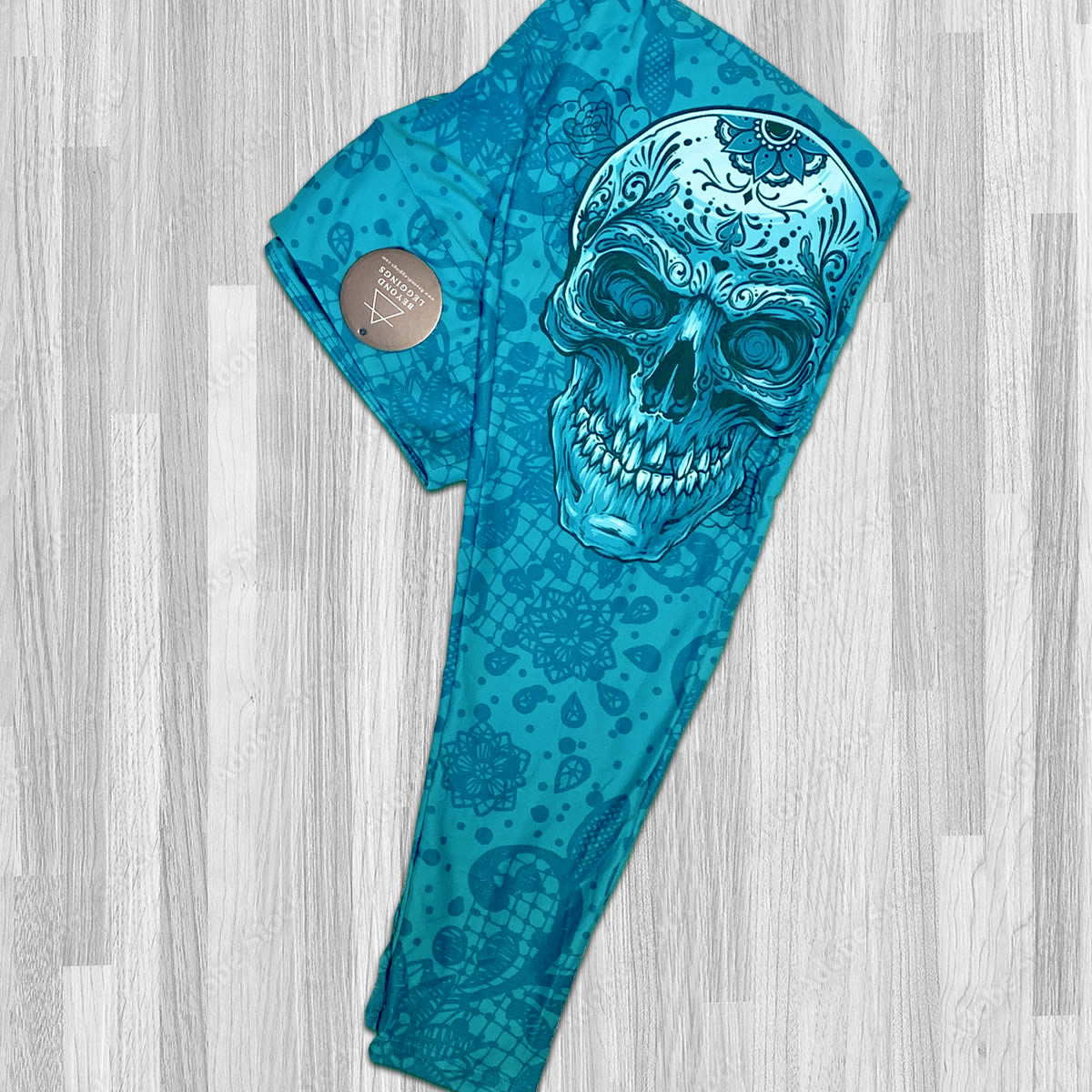 Blue Lace Sugar Skull Asymmetrical Print Teal Leggings