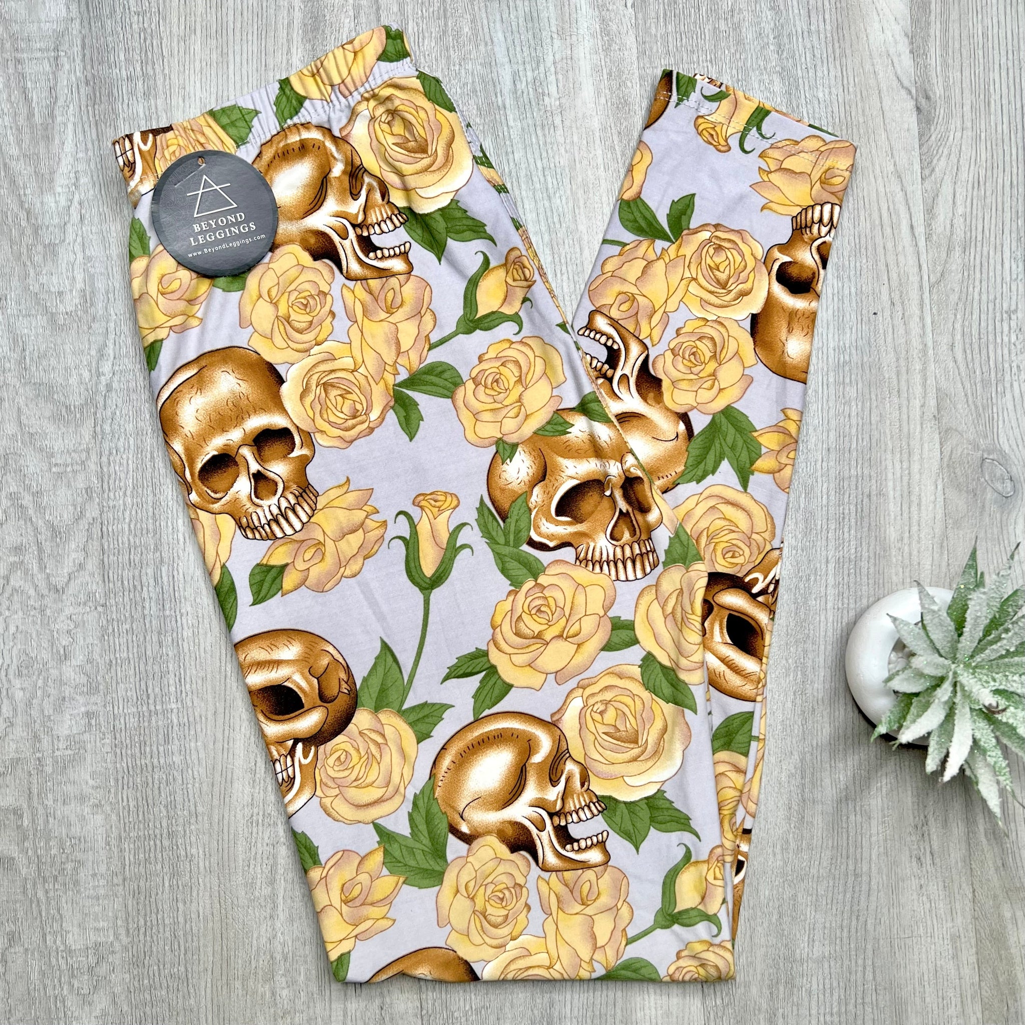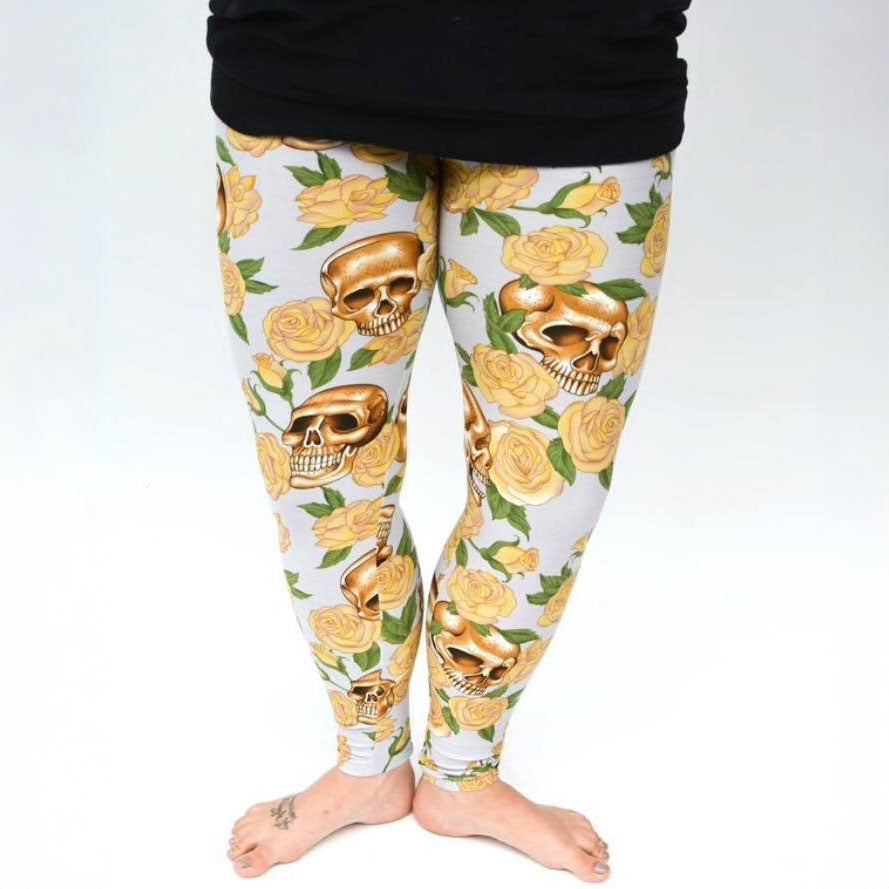 Golden Skull Yellow Rose Print Soft Leggings