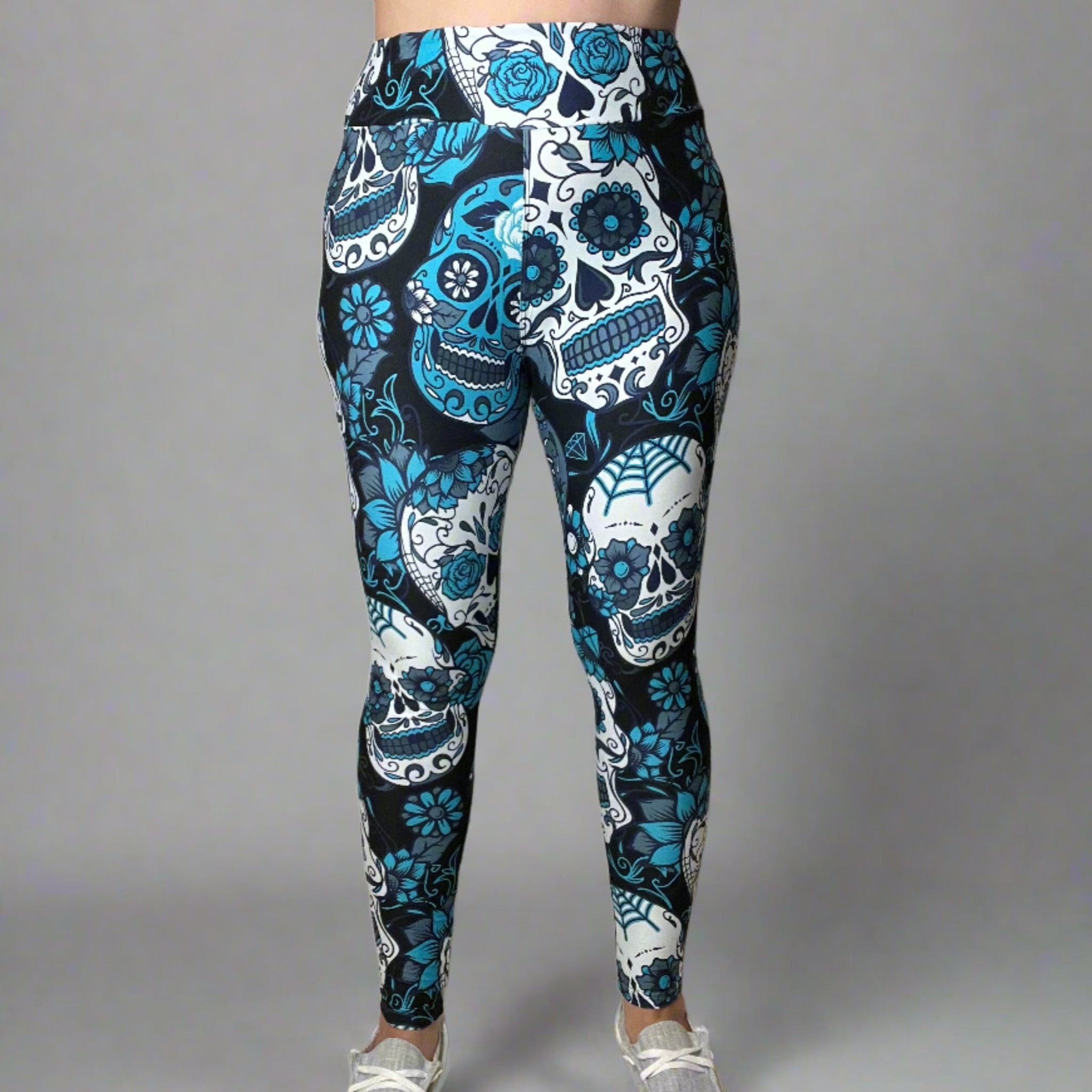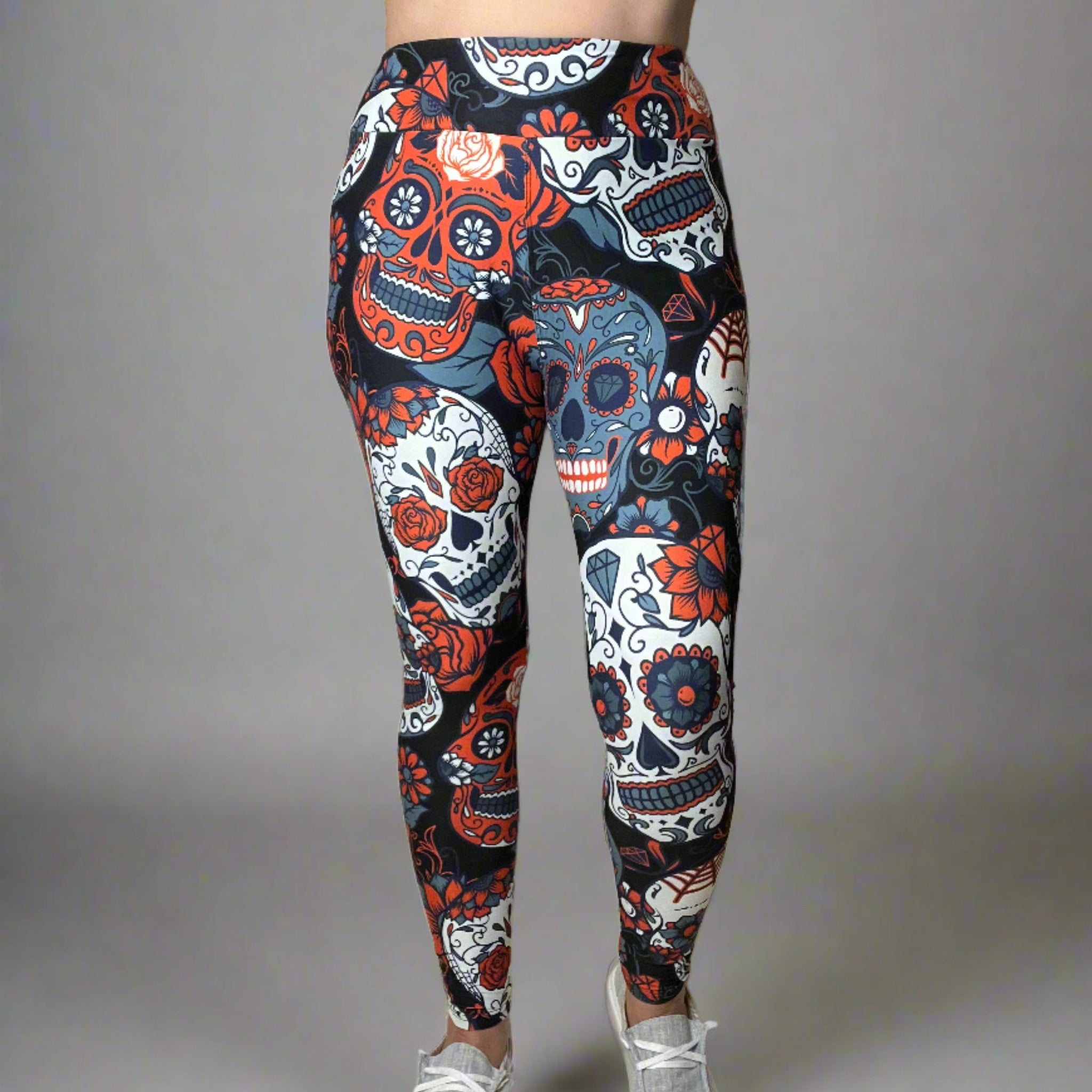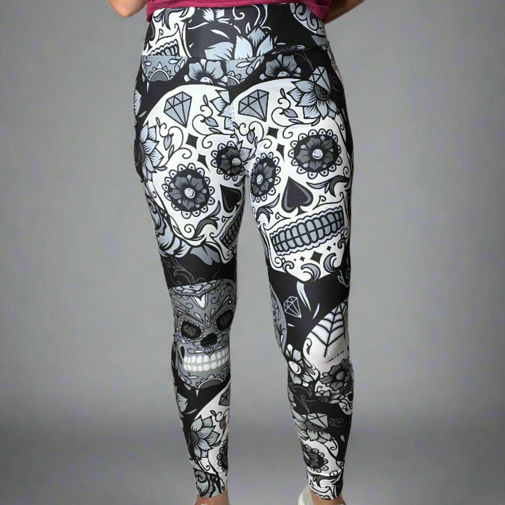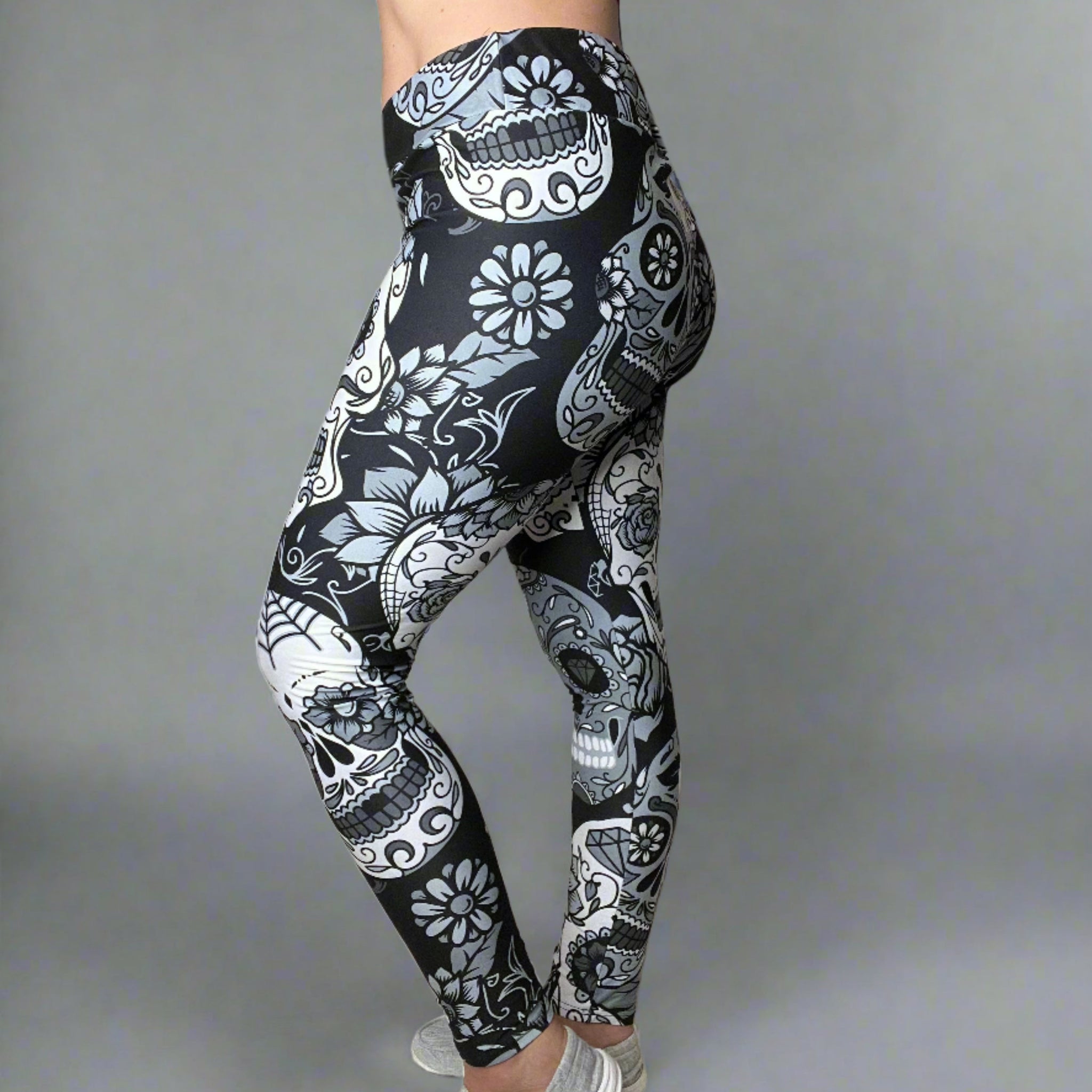 Large Sugar Skull Print Leggings Soft Full Length w/ Pocket In Yoga Band