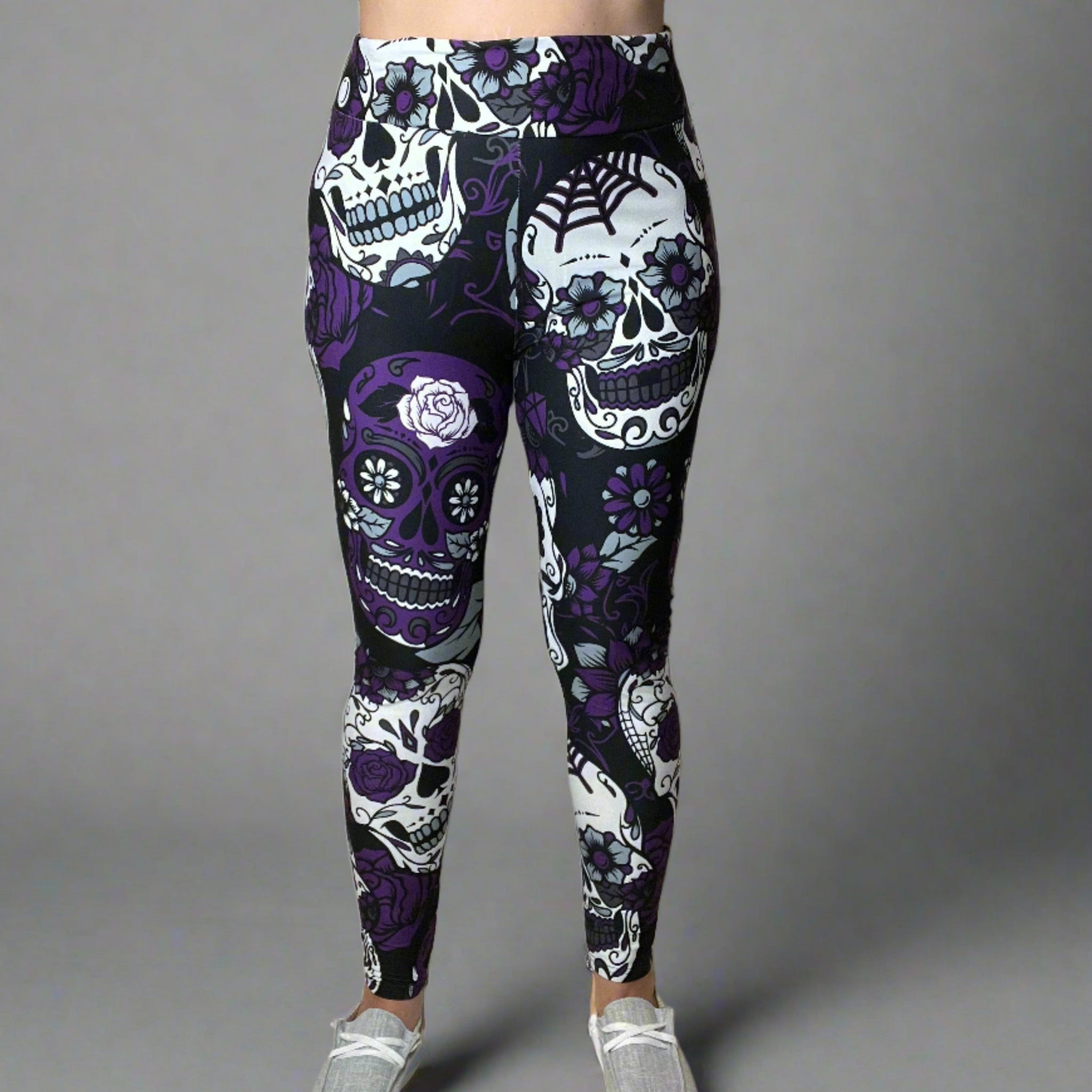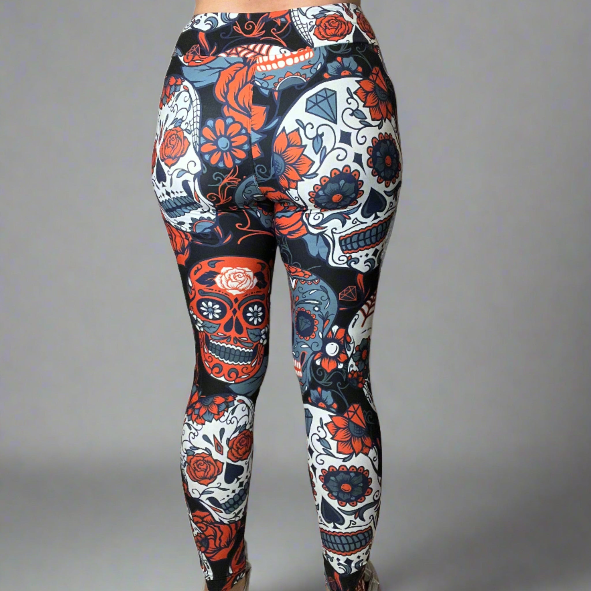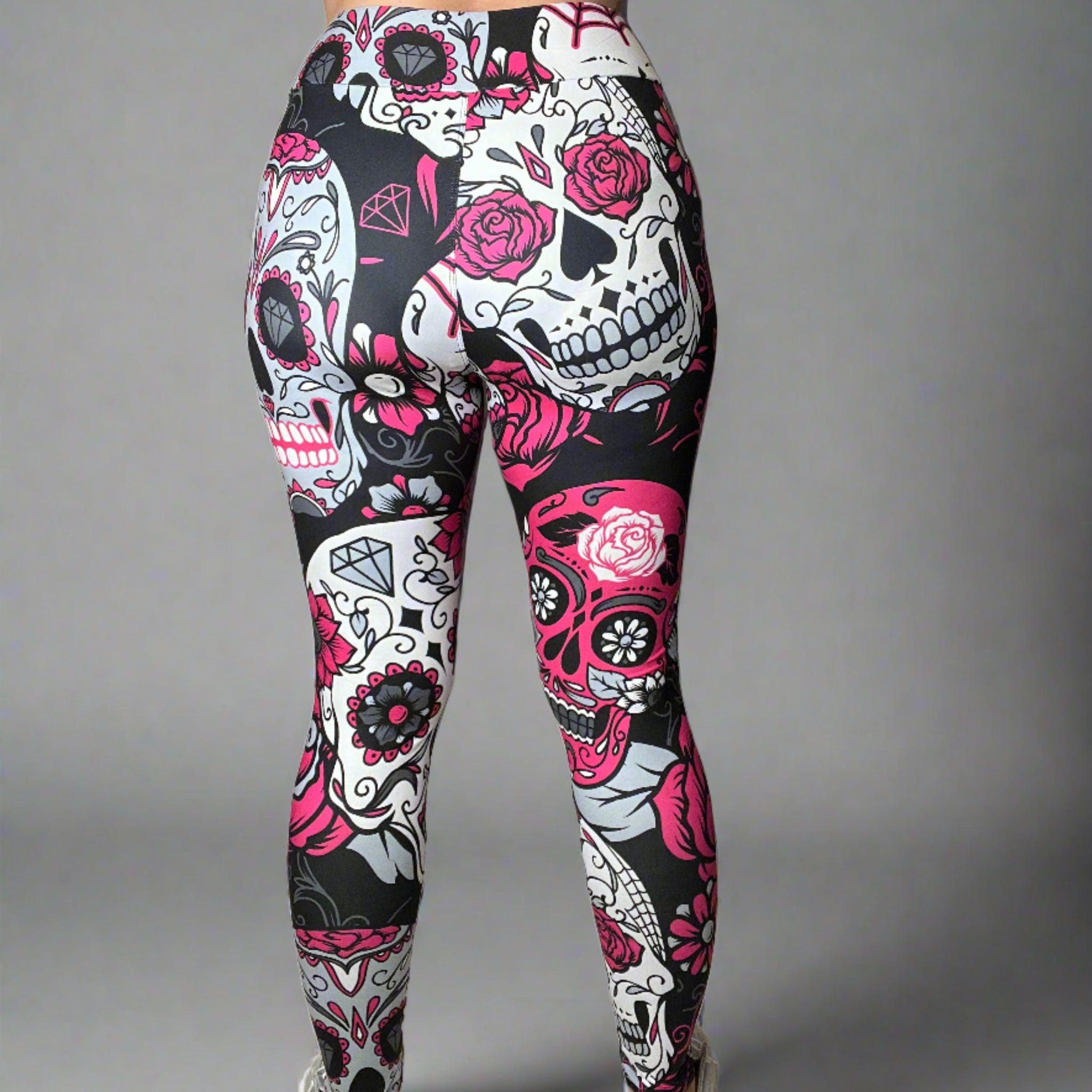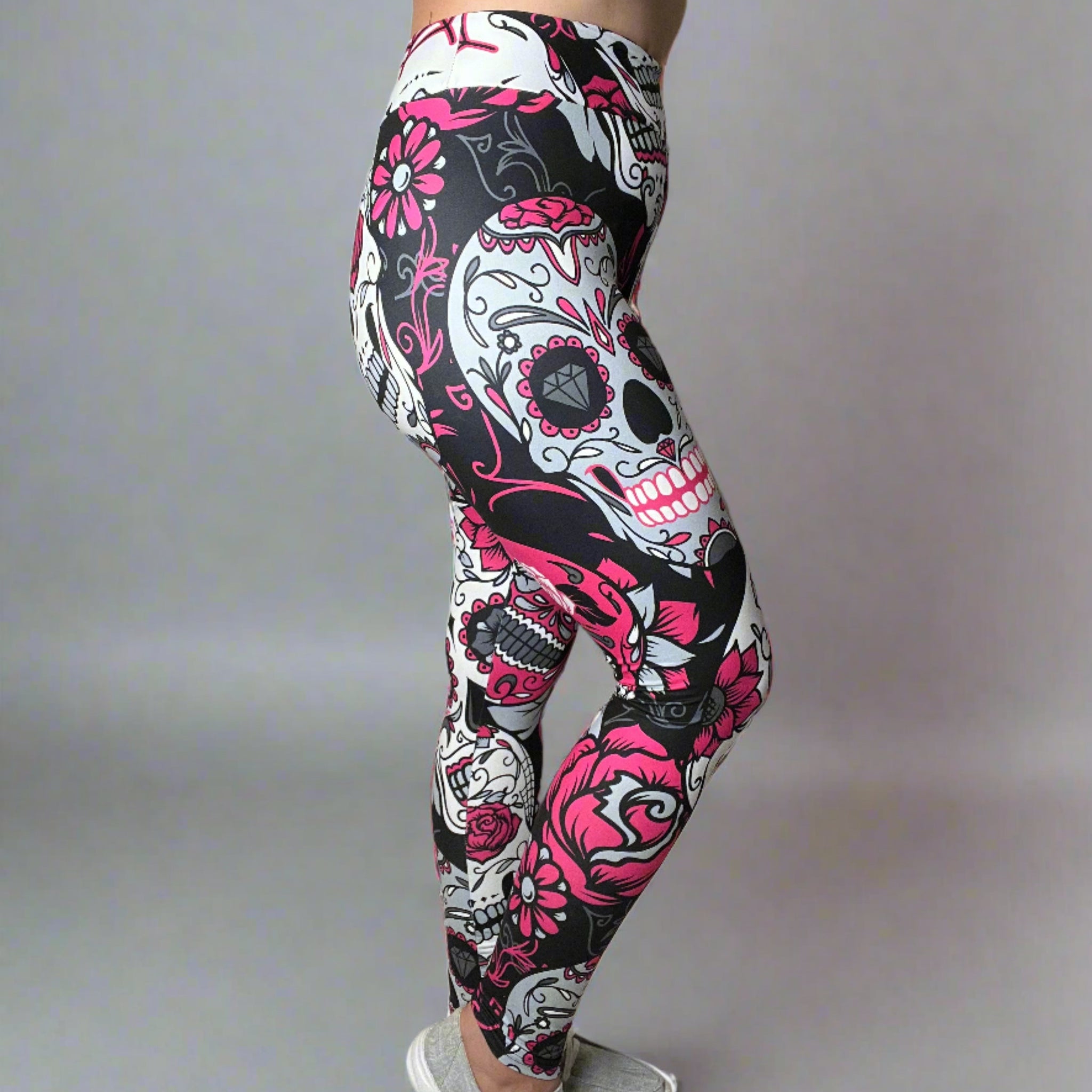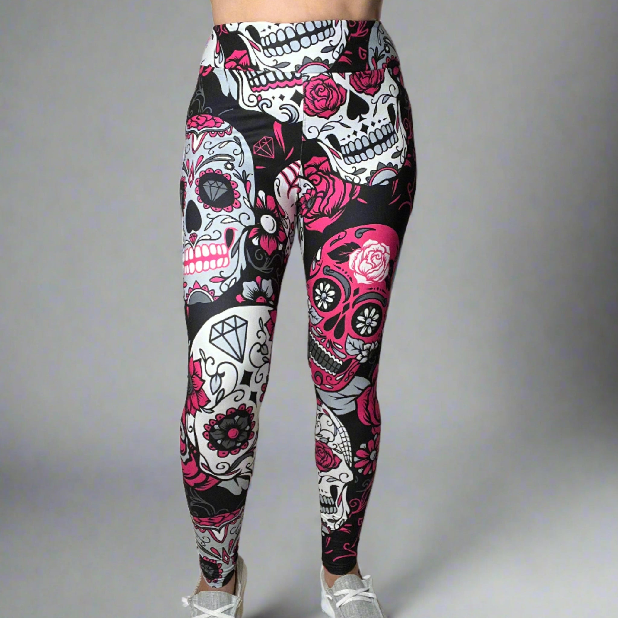 Large Sugar Skull Print Leggings Soft Full Length w/ Pocket In Yoga Band