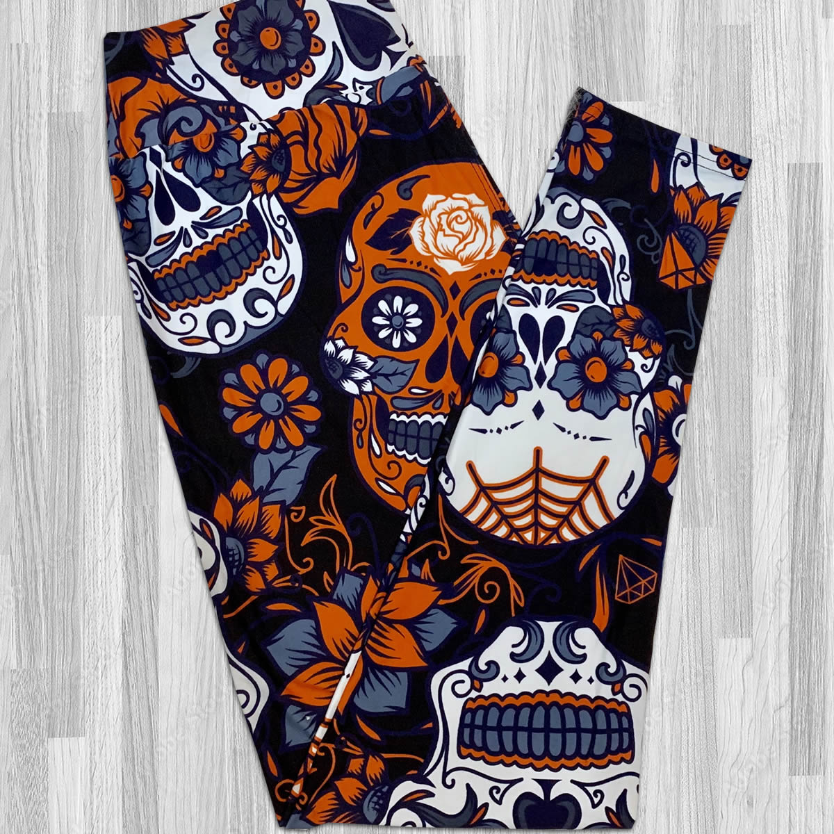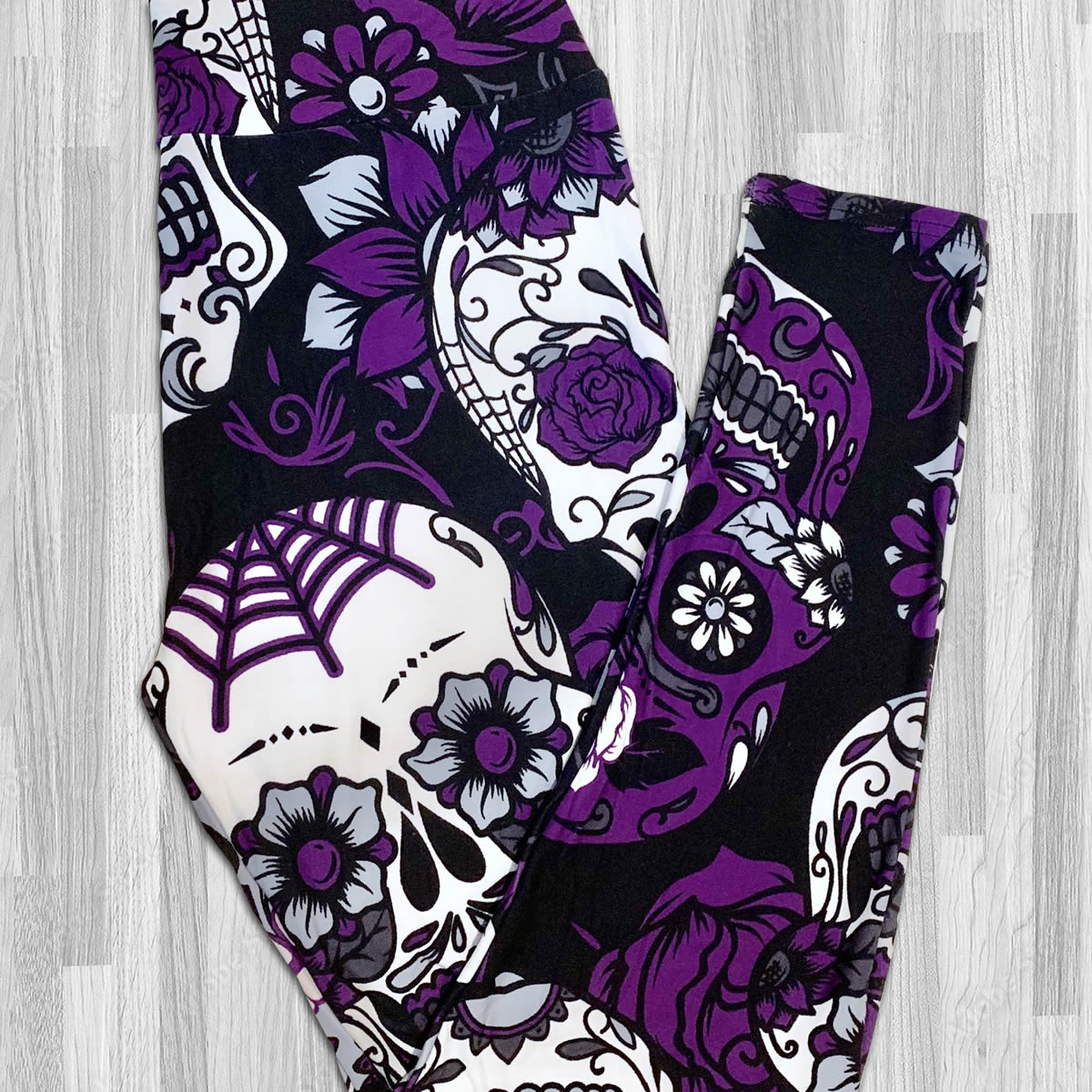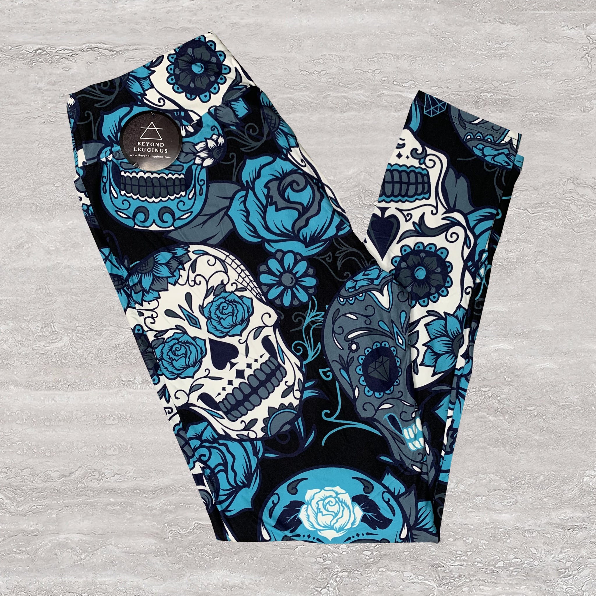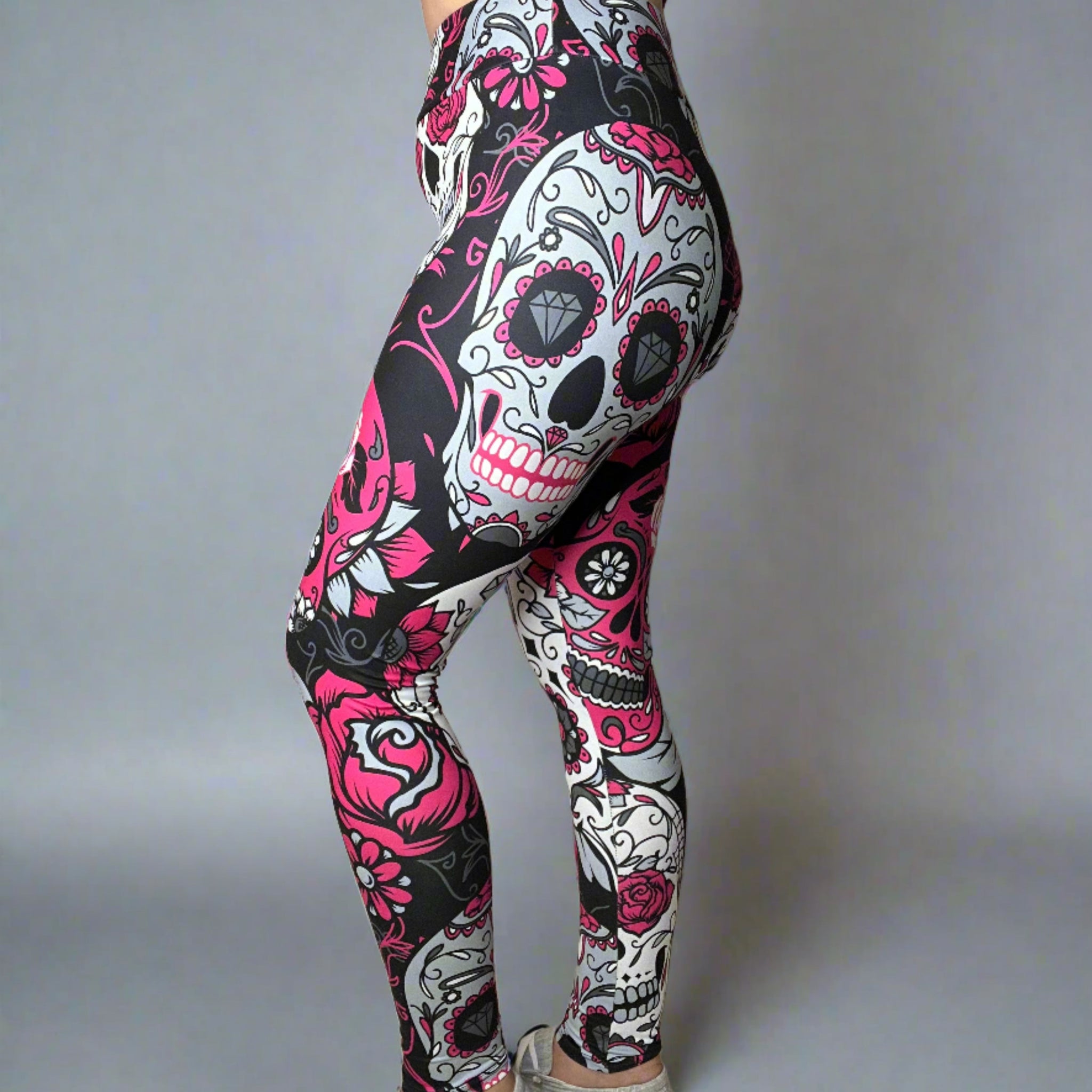 Large Sugar Skull Print Leggings Soft Full Length w/ Pocket In Yoga Band