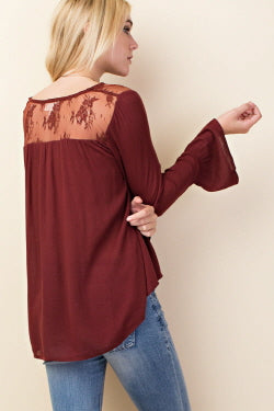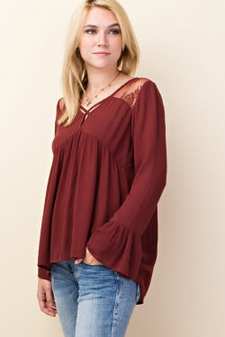 This blouse has lace detail at the shoulders with a criss cross detail at the front. It flows down to your hips with a high low cut.