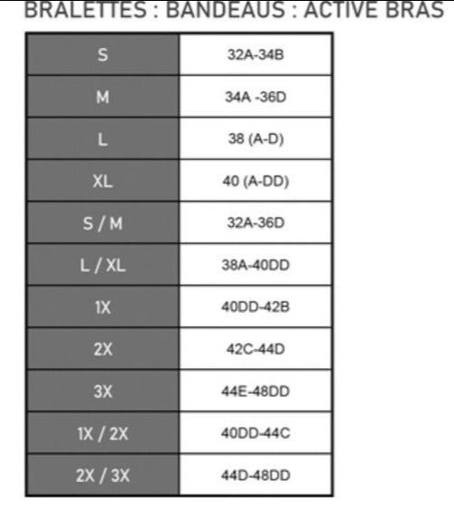 - XL: 38D, 40A, 40B, 40C, 40D, 40DD