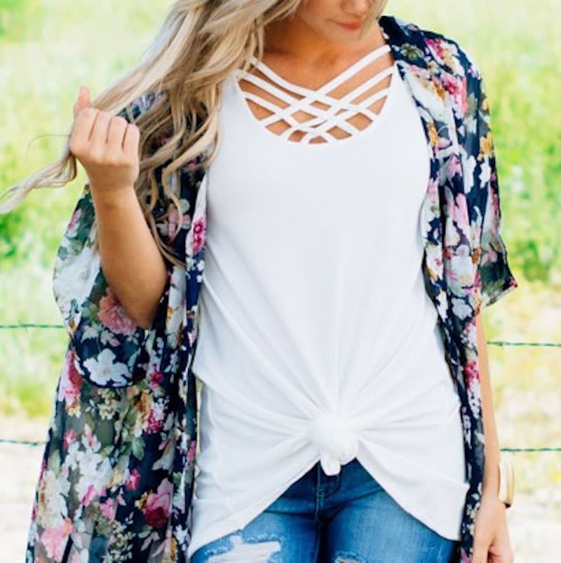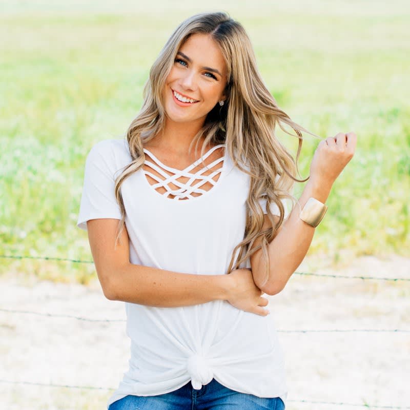 If you haven't jumped on the cross front detail train yet, hop aboard girl! This darling top is a must-have for every girl's wardrobe. Featuring a long length, short sleeve, and ultimate layering potential!