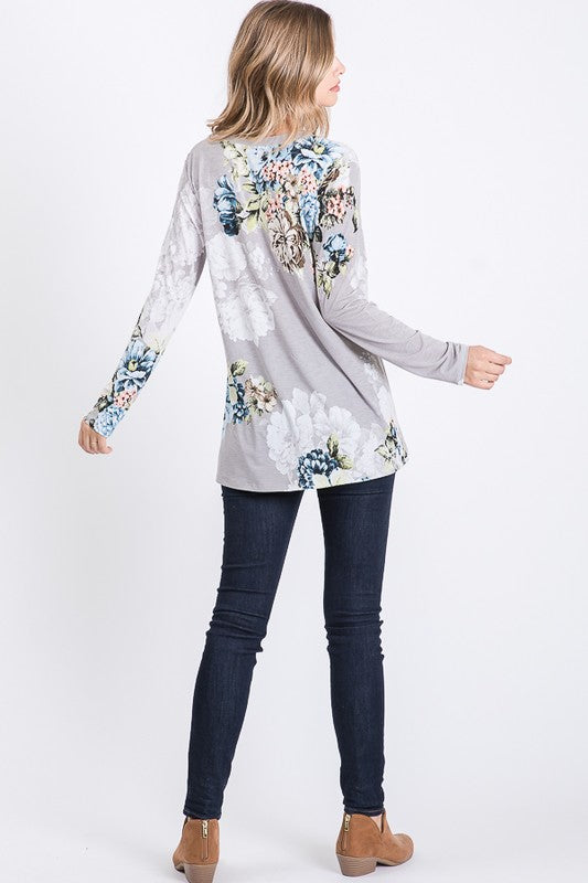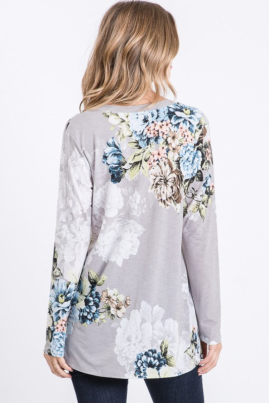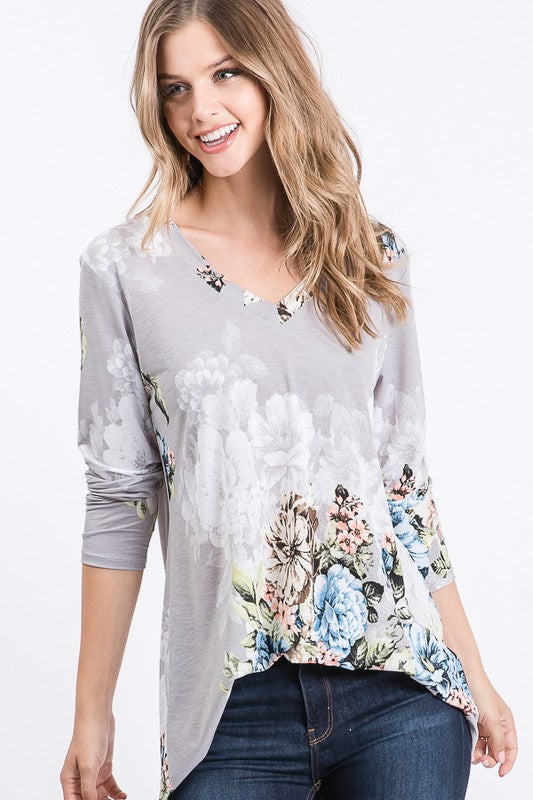 Infuse your wardrobe with the delicate charm of our Long Sleeve Floral Fade Top. Featuring a graceful transition from a solid grey to a vibrant floral print, this top celebrates the beauty of nature. The flowy body and comfortable long sleeves make it an ideal choice for both a relaxed day in or an elegant outing. The V-neck cut enhances its femininity, making it a versatile addition to any fashion-forward collection.