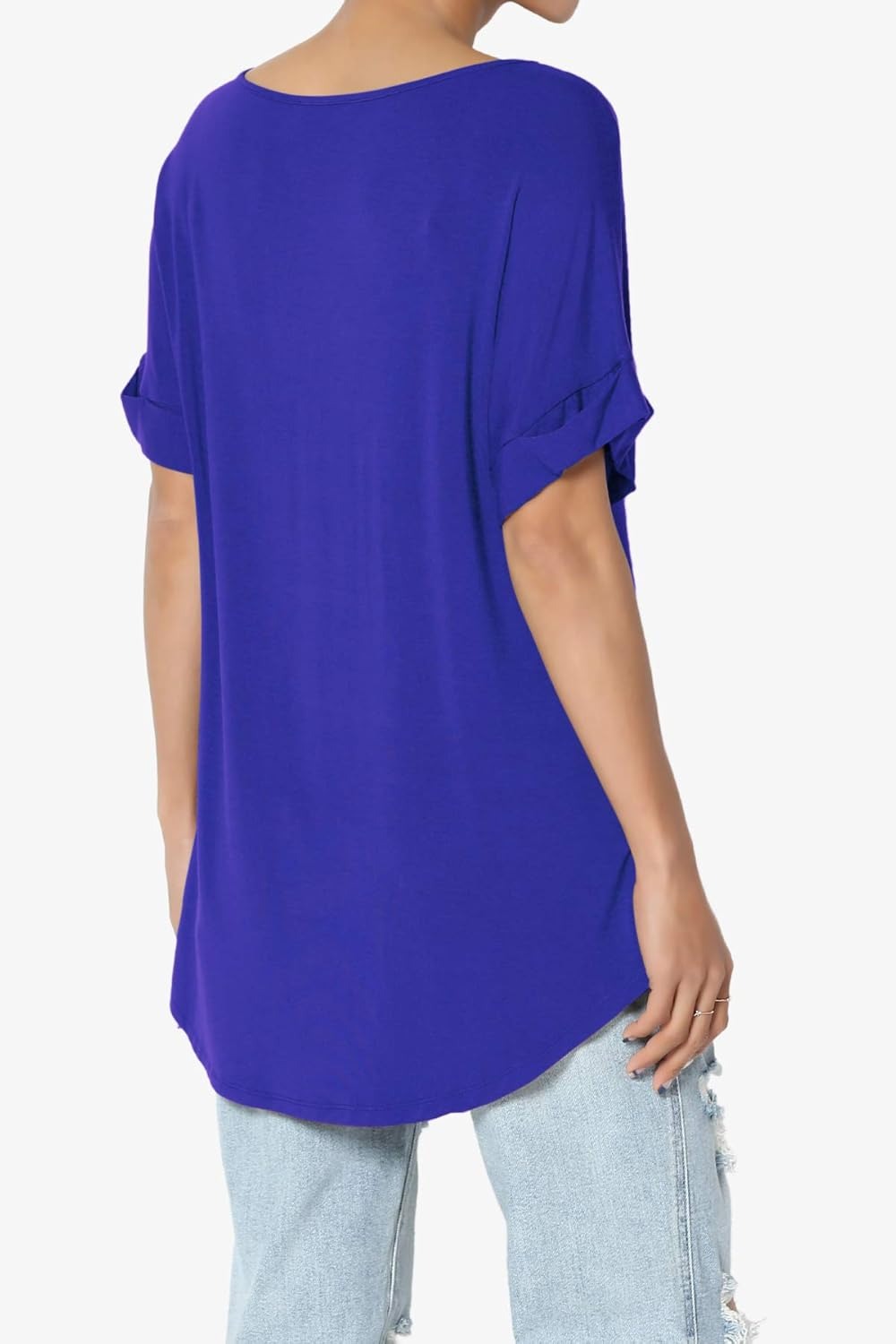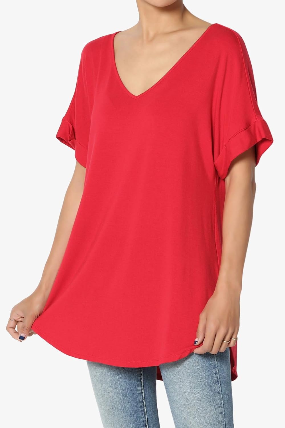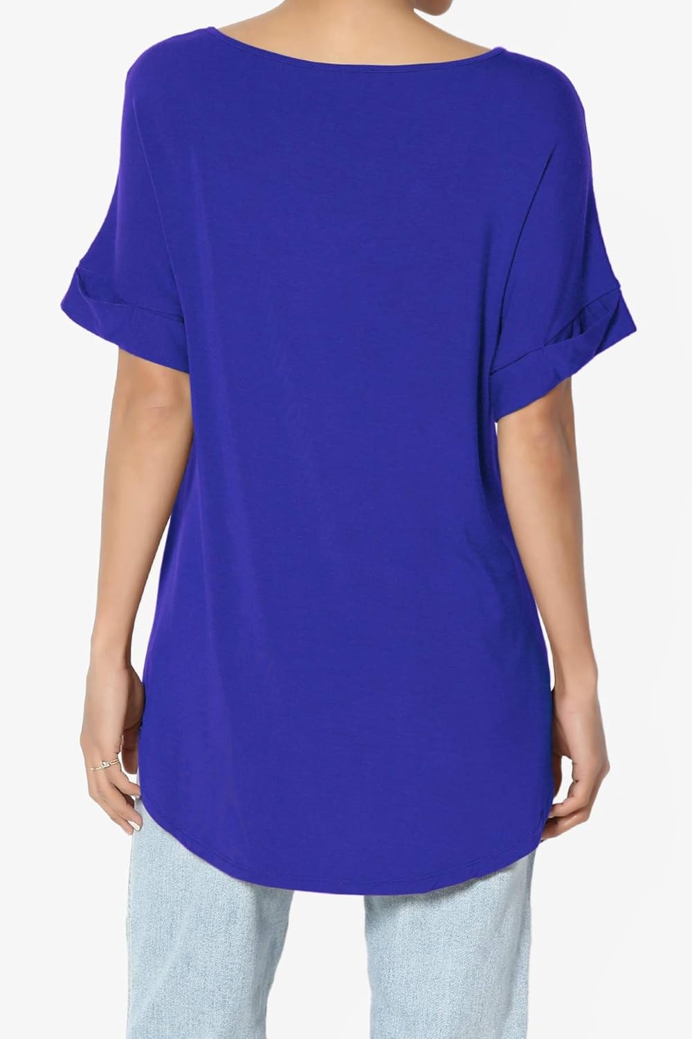 Women's Wide V-Neck Cuffed Short Sleeve Curved Hem Luxe Jersey Top