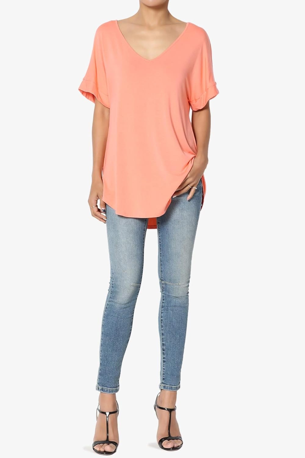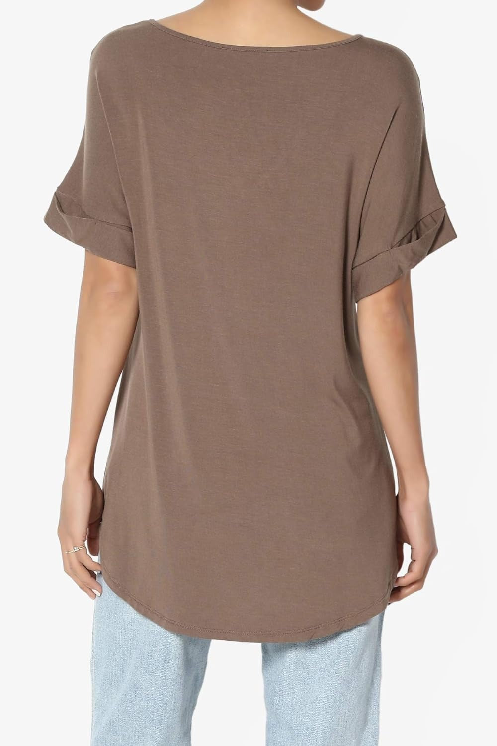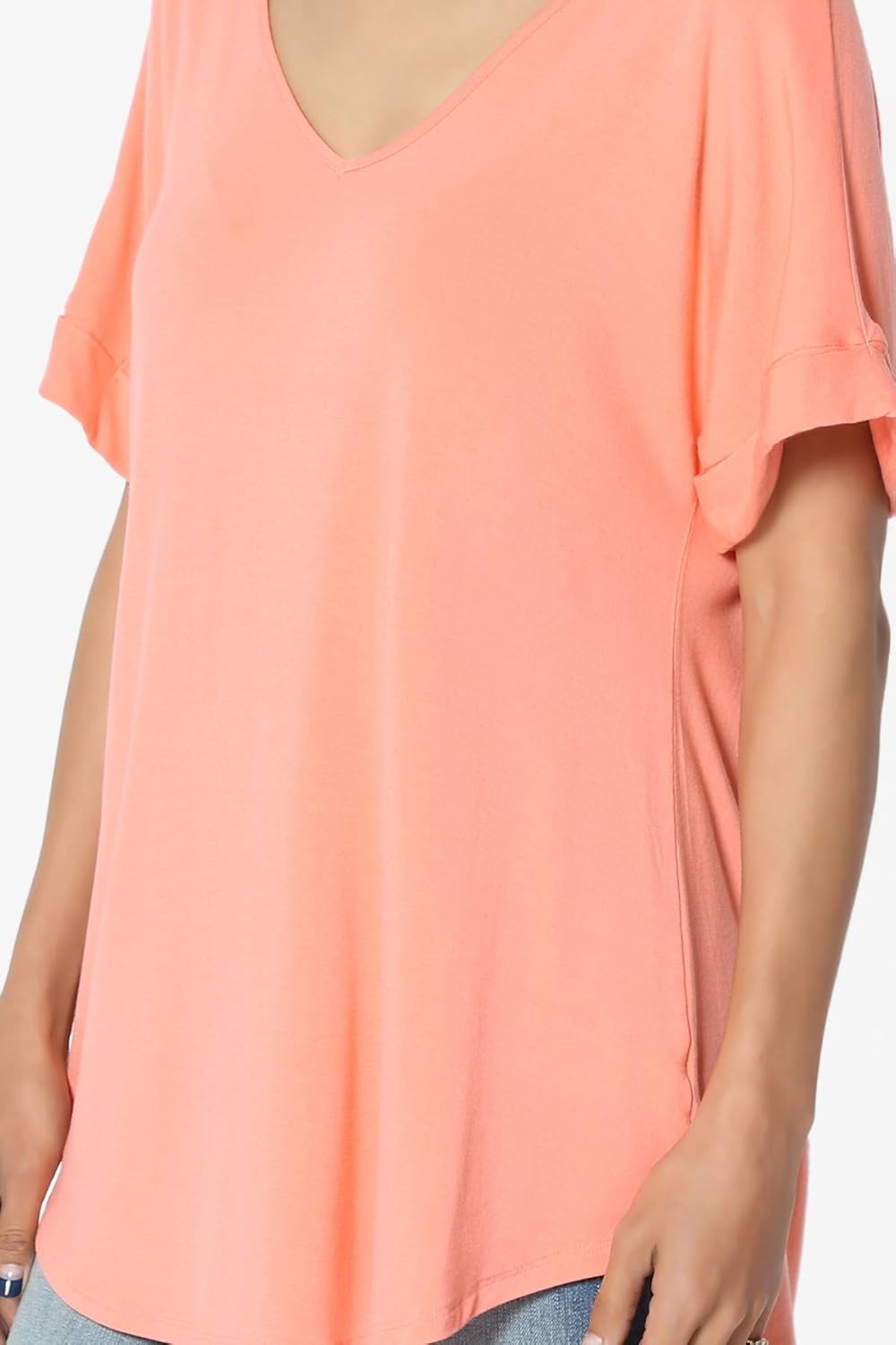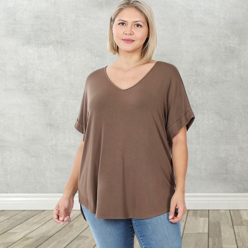 Women's Wide V-Neck Cuffed Short Sleeve Curved Hem Luxe Jersey Top