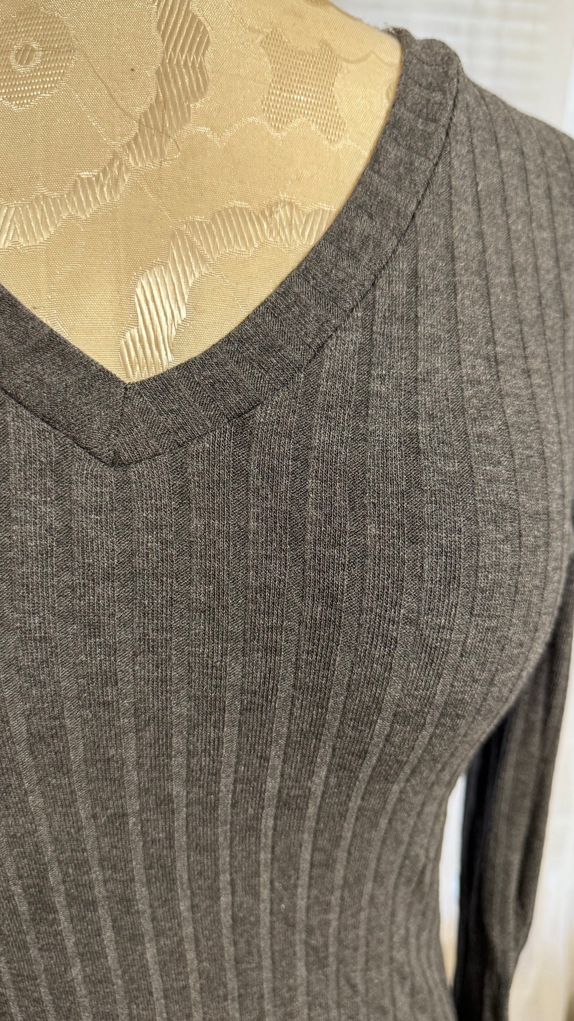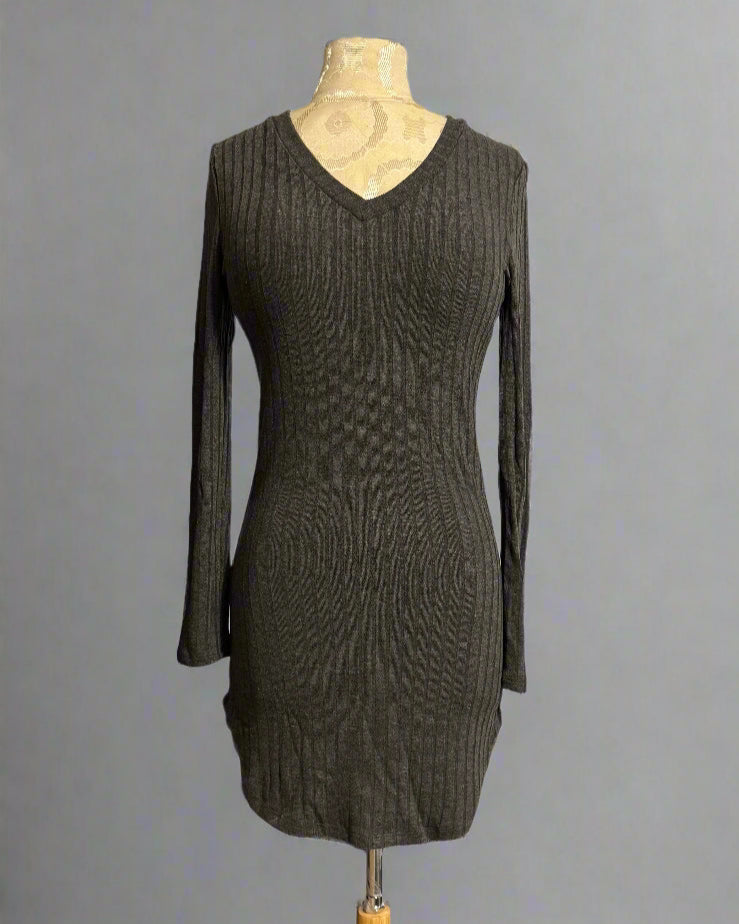 Ribbed Knit V-neck Curved Hem Bodycon Long Sleeve Dress