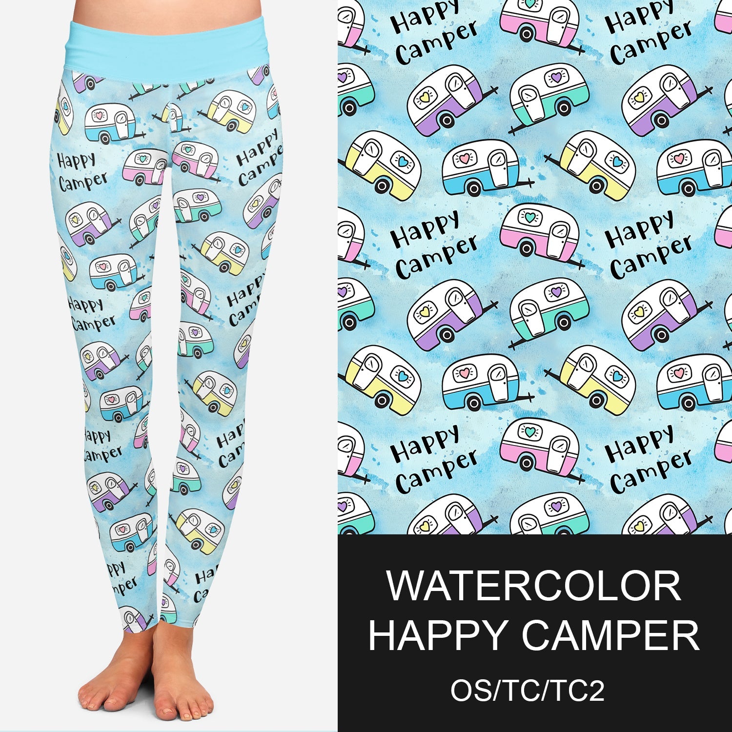 With a colorful all over design, these buttery soft leggings feature campers in different colors and has the words Happy Camper in black through out the design. Featured on a blue watercolor background, these leggings are made with the convenience of side pockets. Pockets are square in shape and are sewn on the outside of the leggings approximately 4 inches below the waistband.