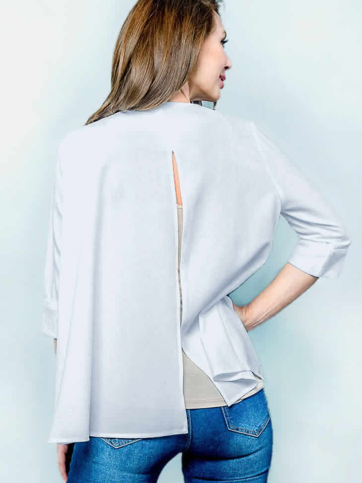 Draped blazer with back slit and sequins running down the lapels. Three-quarter length sleeves with sewn cuffs. Two front faux pockets at hips. Slightly longer in front and shorter in back.