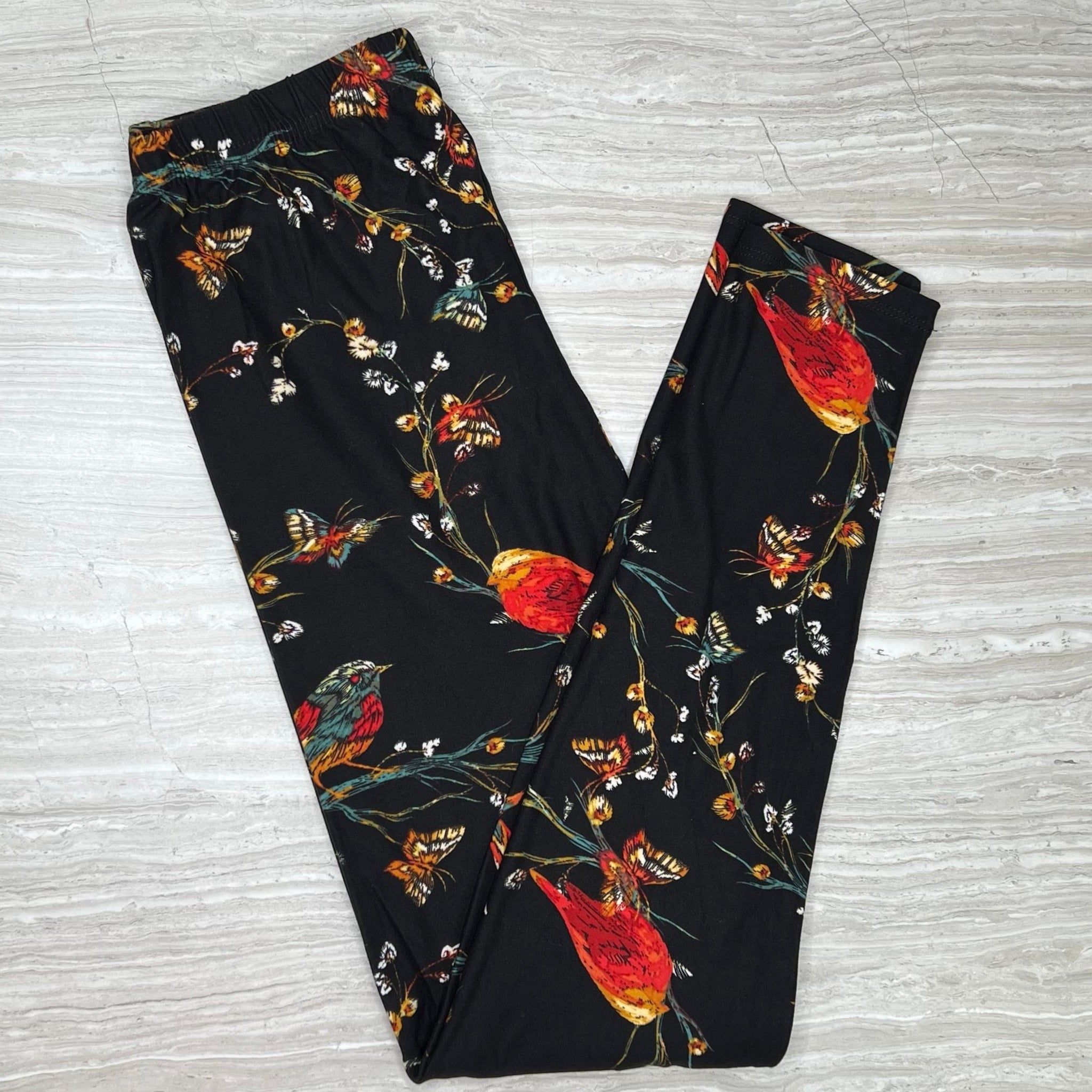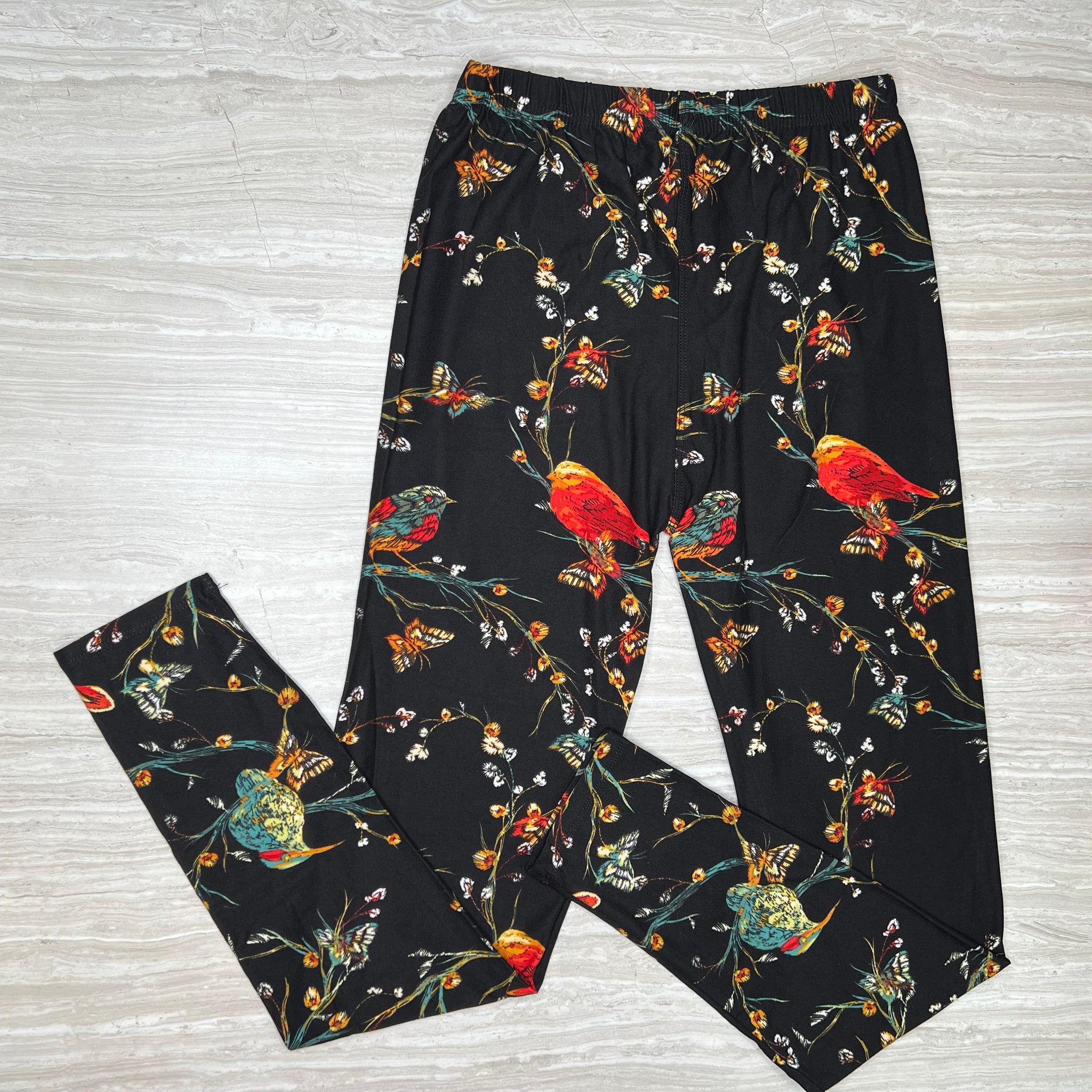 Embroidered Look Birds & Butterflies Print Soft Leggings