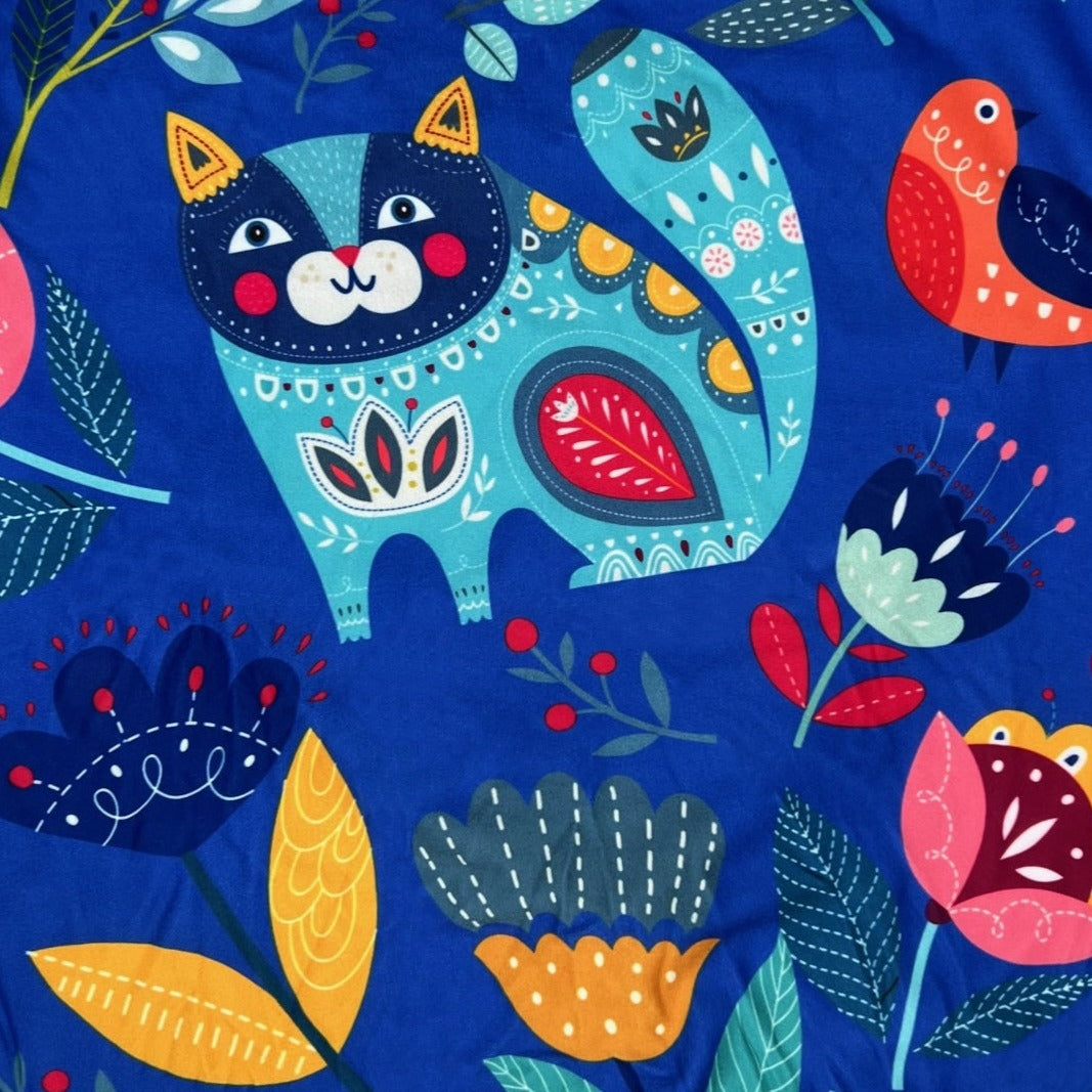Storybook Whimsical Cat Bird Flower Print Soft Blue Leggings