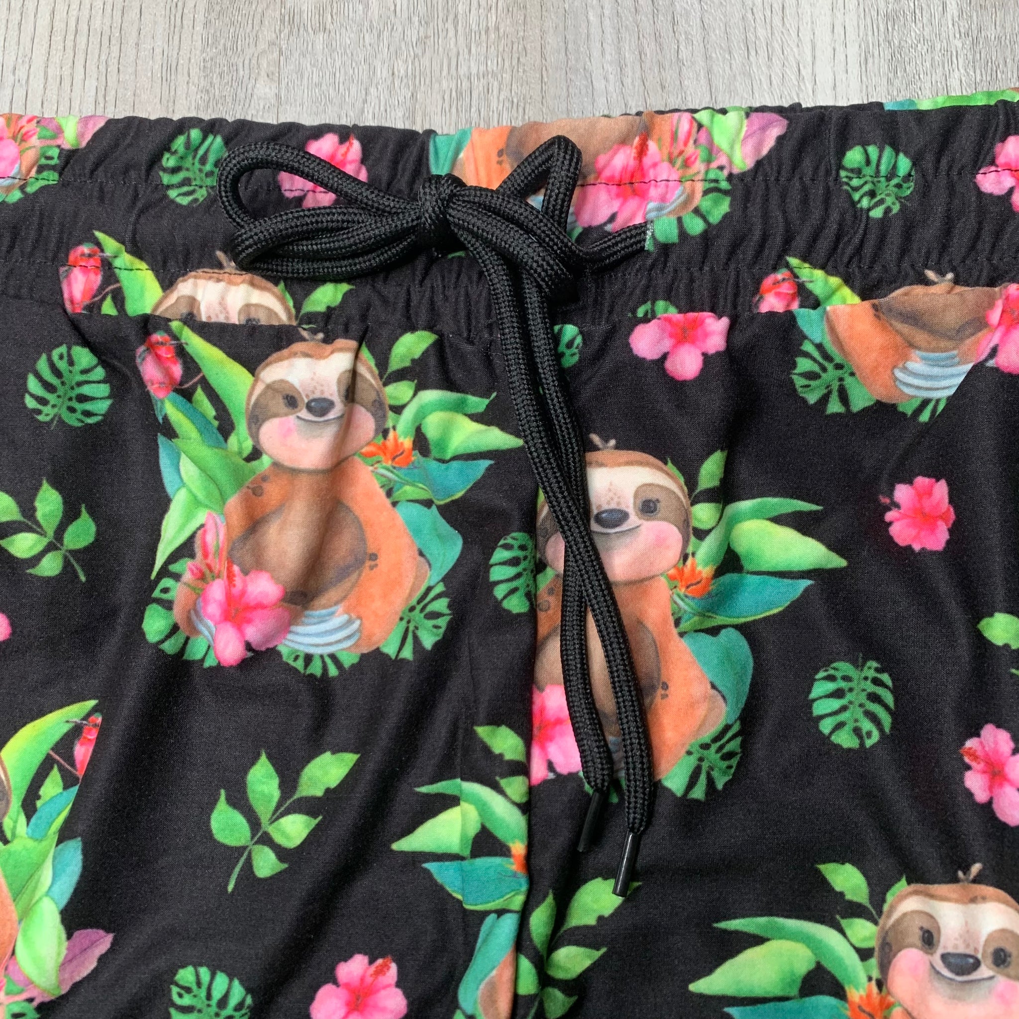 Adorable Sloth w/ Pink Hibiscus Flower Print Capri Black Joggers W/ Pockets