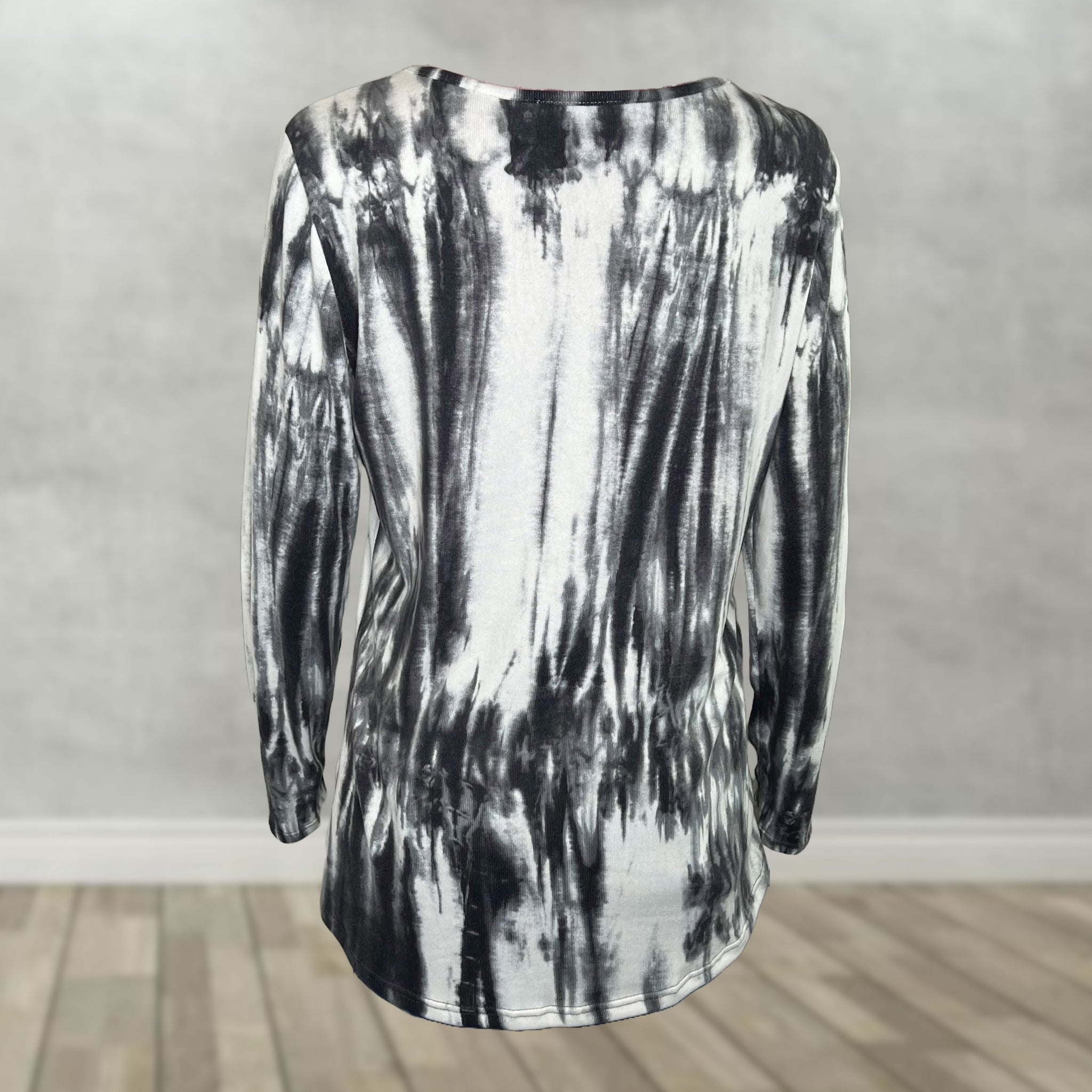 TL;DR: A long sleeve black and ivory tie-dye top with a lace-up V-neck detail that combines comfort with a dramatic edge, perfect for various occasions.