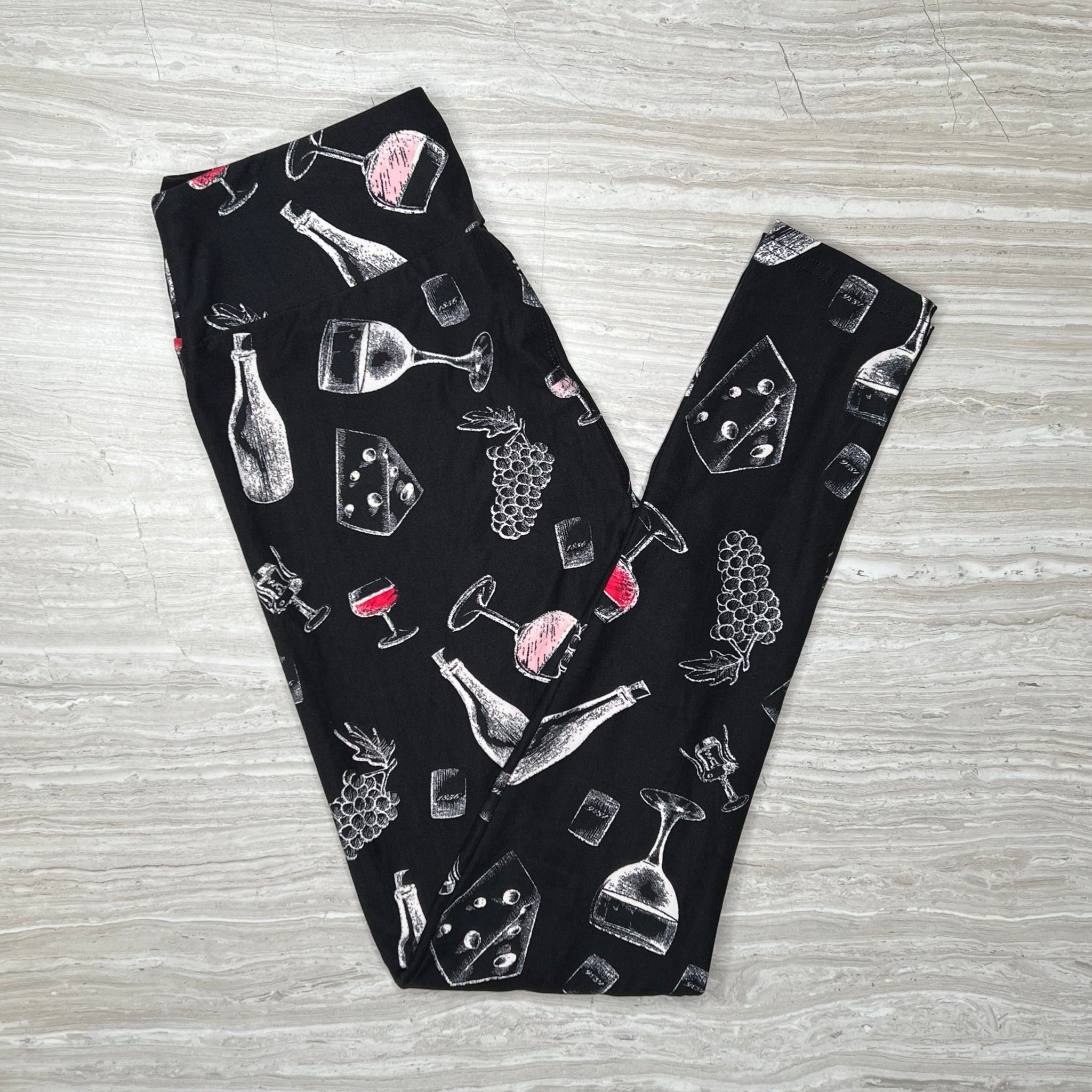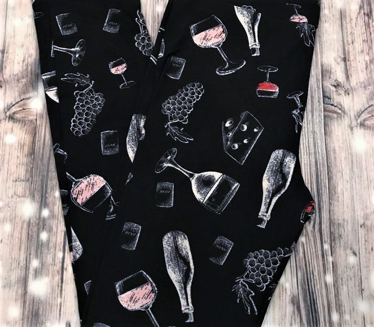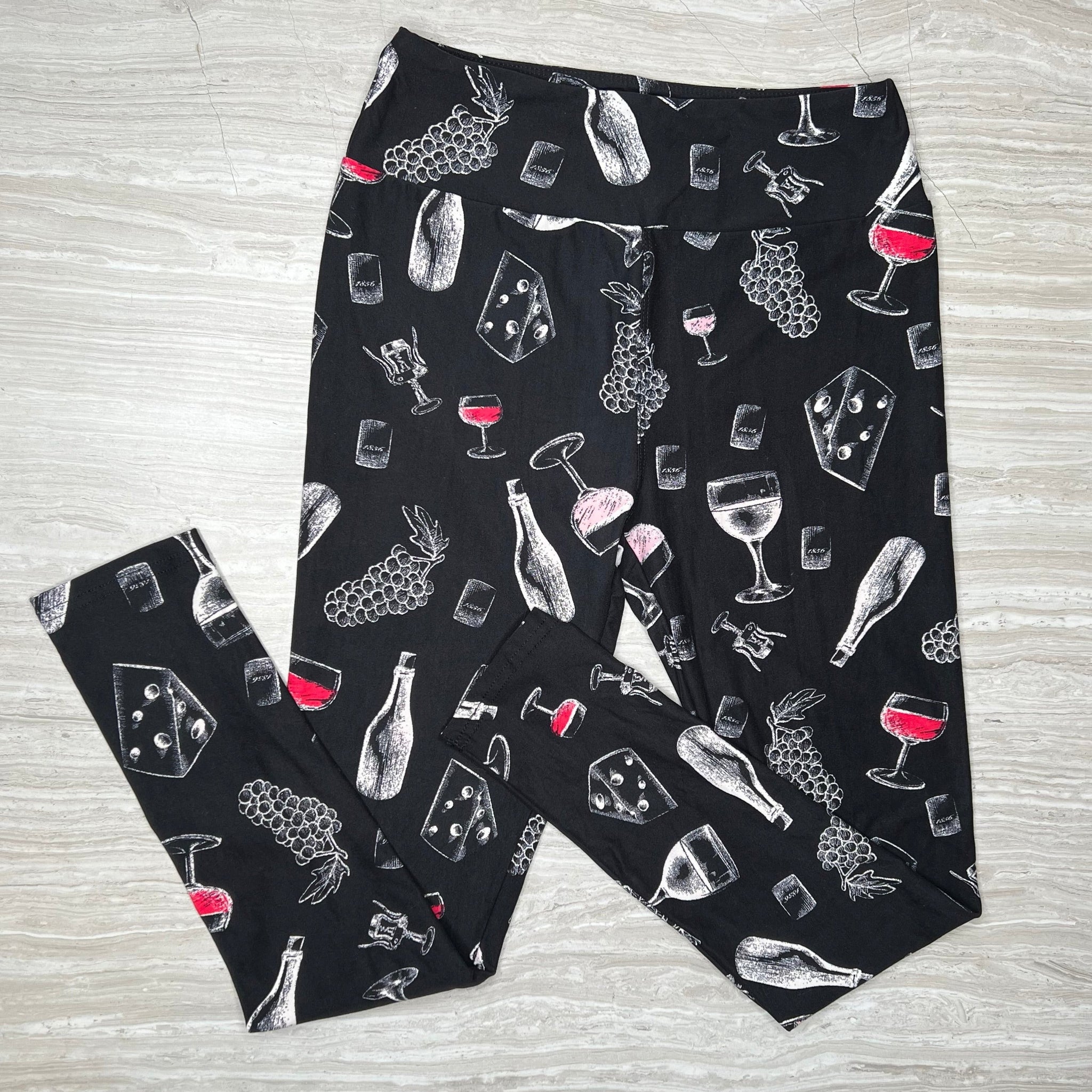 Wine & Cheese Print Black Leggings - Elegant Vino and Fromage Pattern Pants for Culinary Enthusiasts and Casual Chic Style