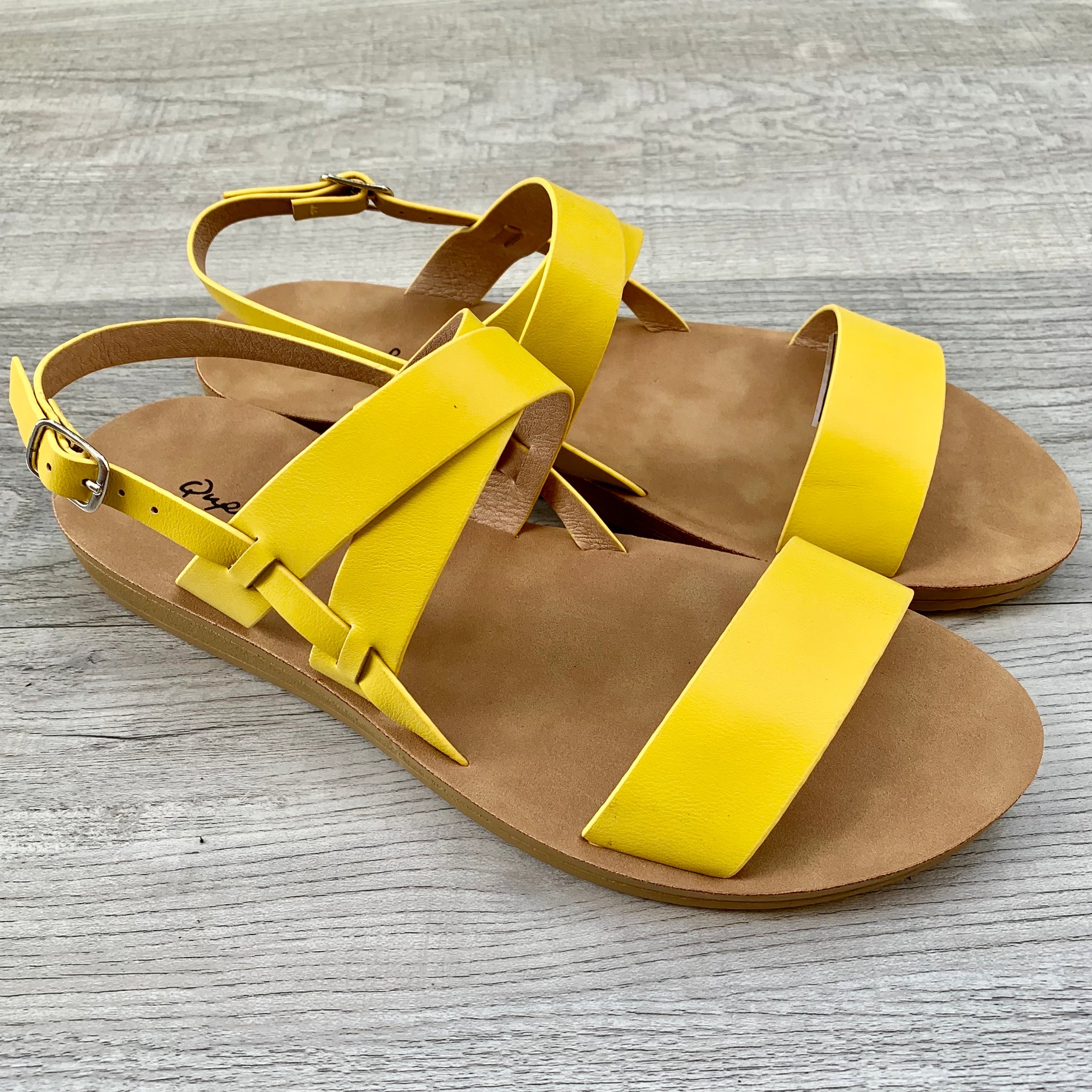 Slip these comfortable sandals on to complete all your favorite outfits! Made out of faux leather, these sandals feature a lovely criss cross design and an adjustable ankle strap, perfect for when you're on-the-go. You can wear these sandals with your favorite pair of ankle jeans or with a denim jumper for a super cute and laid-back summer outfit! Made with all man-made/vegan materials.