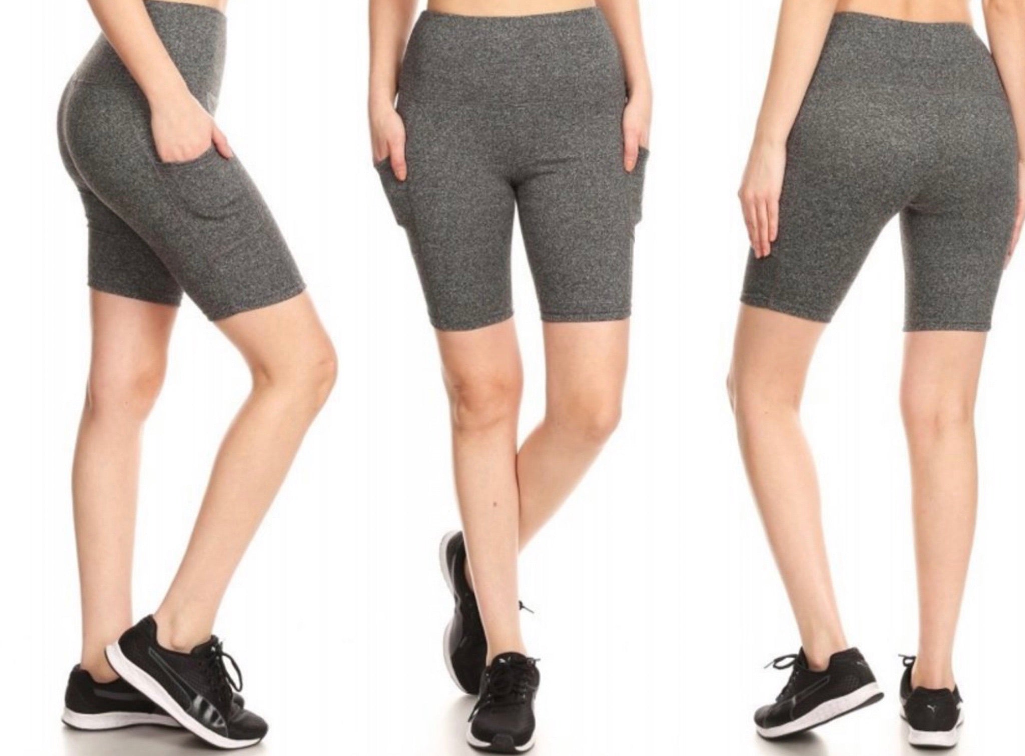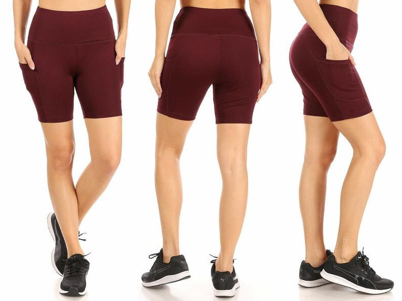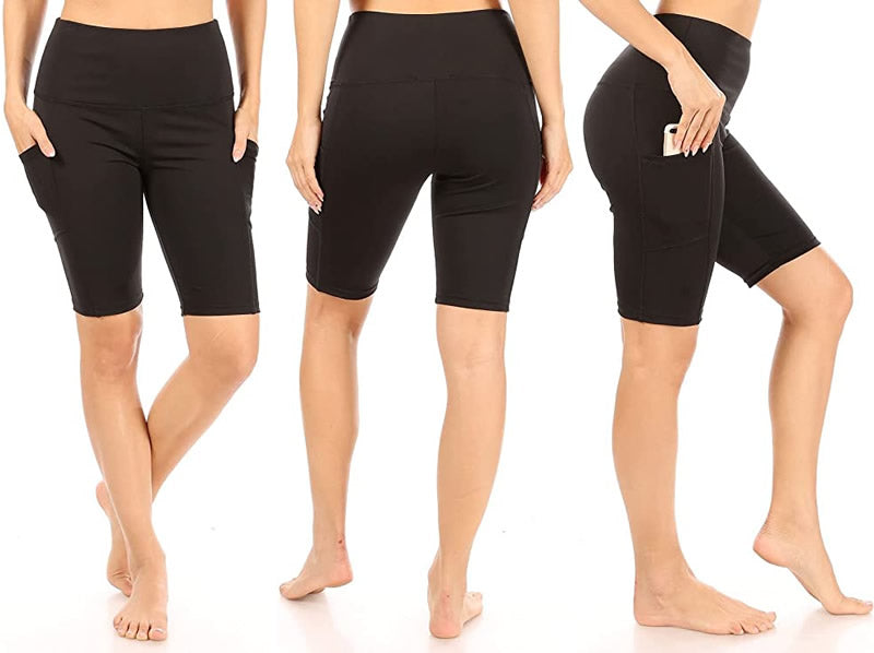 Solid color, high waist banded tummy control, tuck waist biker shorts with side phone pockets.