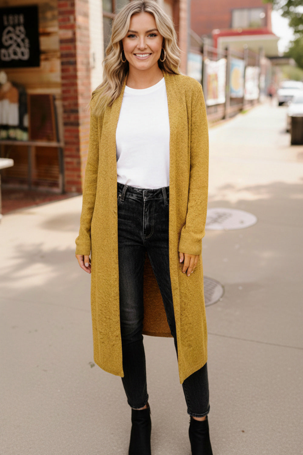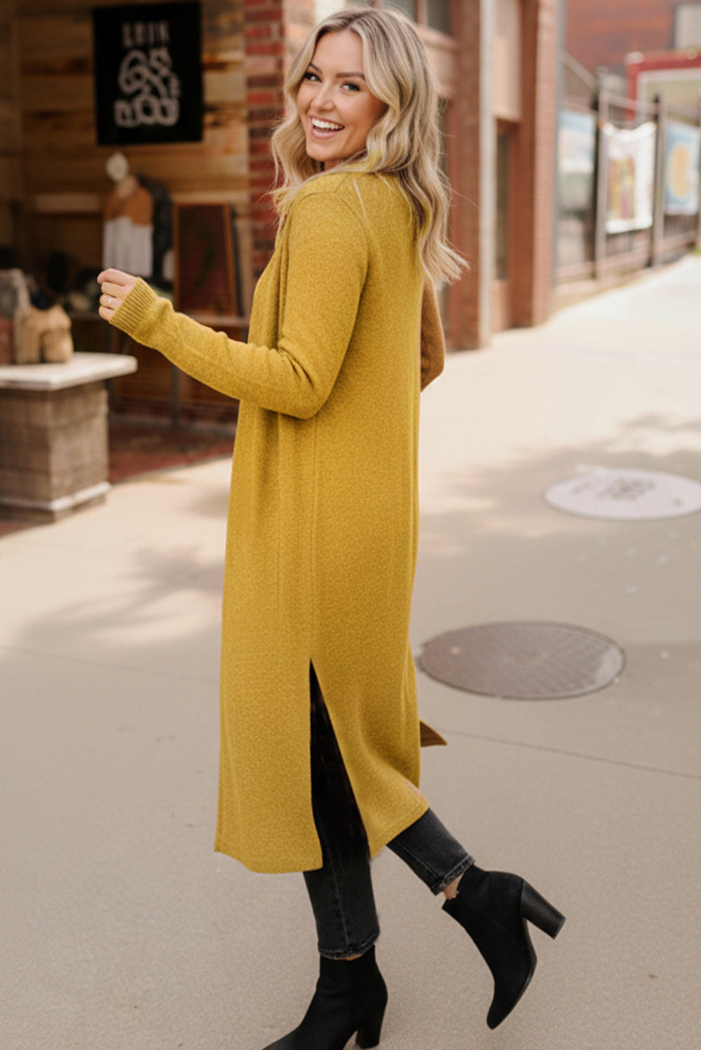 This butter yellow long cardigan is the layering piece your closet will reach for all season long. Crafted in a warm butterscotch hue, it features a lightweight yet cozy and warm knit that drapes beautifully without feeling bulky. The open-front design and side slits give it a modern, flattering silhouette that pairs perfectly with denim, leggings, or dresses. Whether you are headed to the office, running errands, or out for a fall coffee date, this duster adds instant polish and comfort to any outfit.