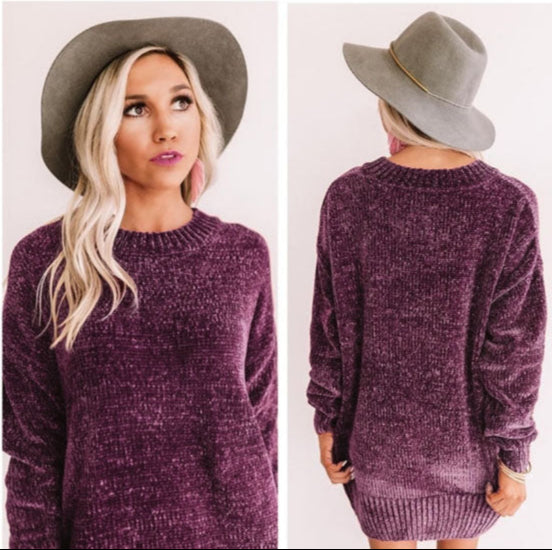 Chenille Pullover Crew Neck Oversized Sweater - Eggplant