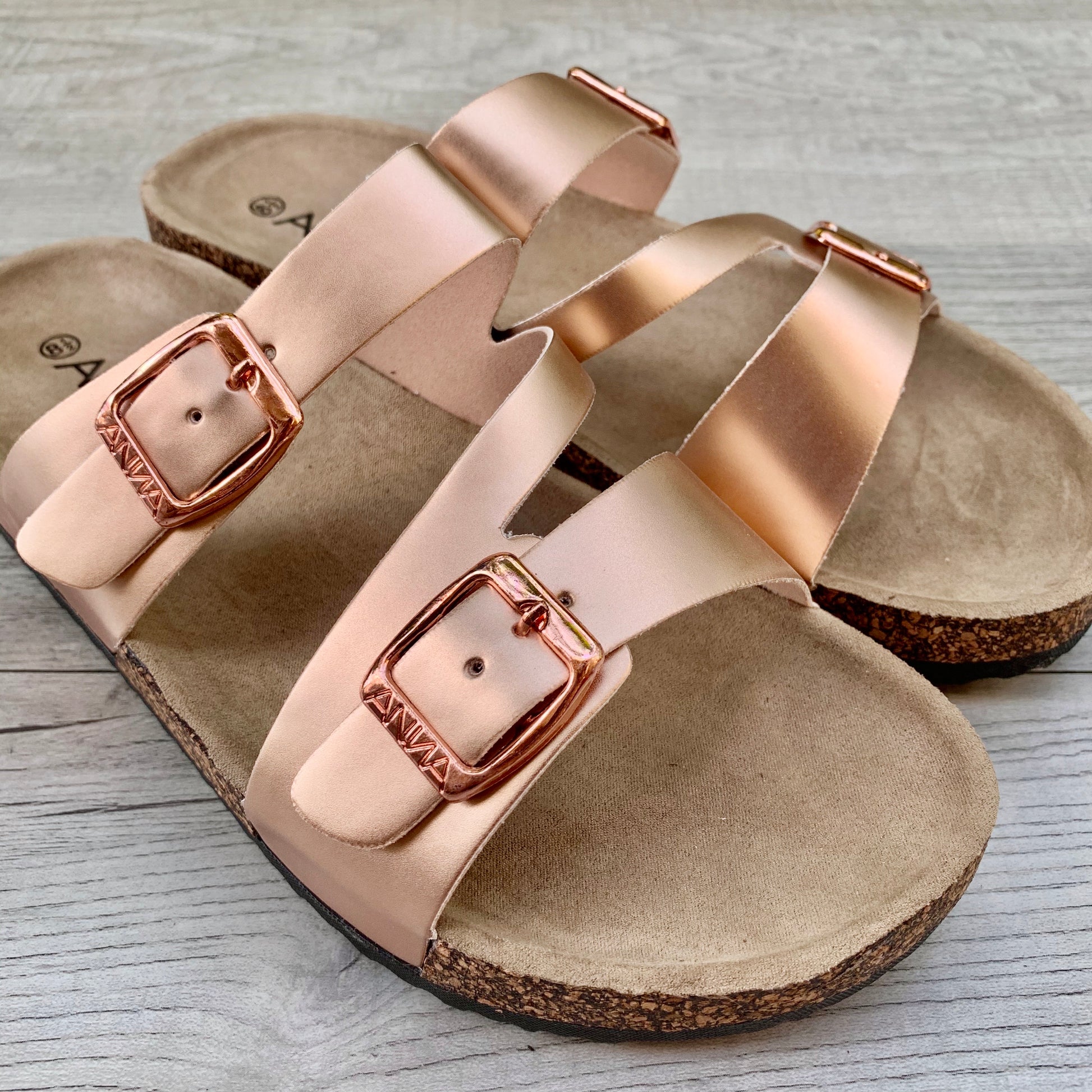 Fall in love with these super cute triple buckle sandals! These sandals feature a slip-on design for easy on/off access. The cork sole provides maximum comfort and support, while the trendy double buckle design gives these shoes some extra style. You can wear these sandals with a pair of raw hem ankle jeans and a vintage band tee for the cutest everyday outfit! Made with all man-made/vegan materials.