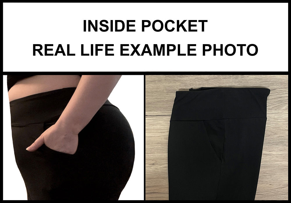 These leggings are featured on a black background with a faint sunflower pattern. Leggings are made with the convenience of inside pockets. Pockets are sewn on the inside of the leggings.