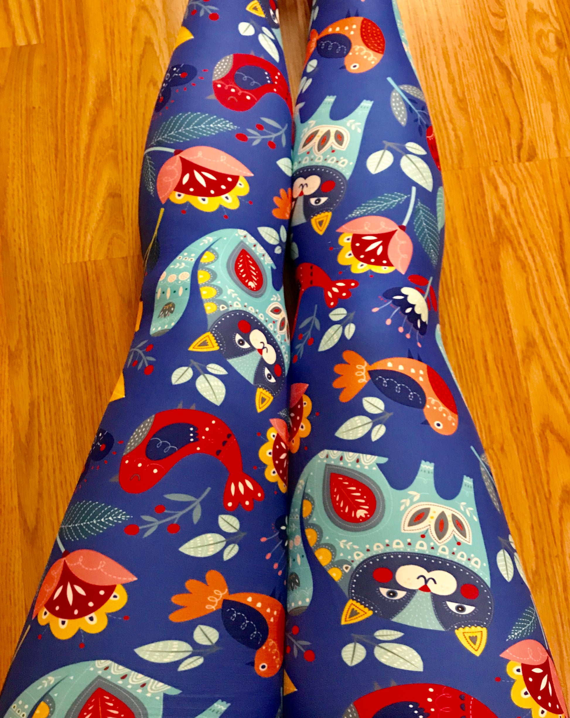 Storybook Whimsical Cat Bird Flower Print Soft Blue Leggings